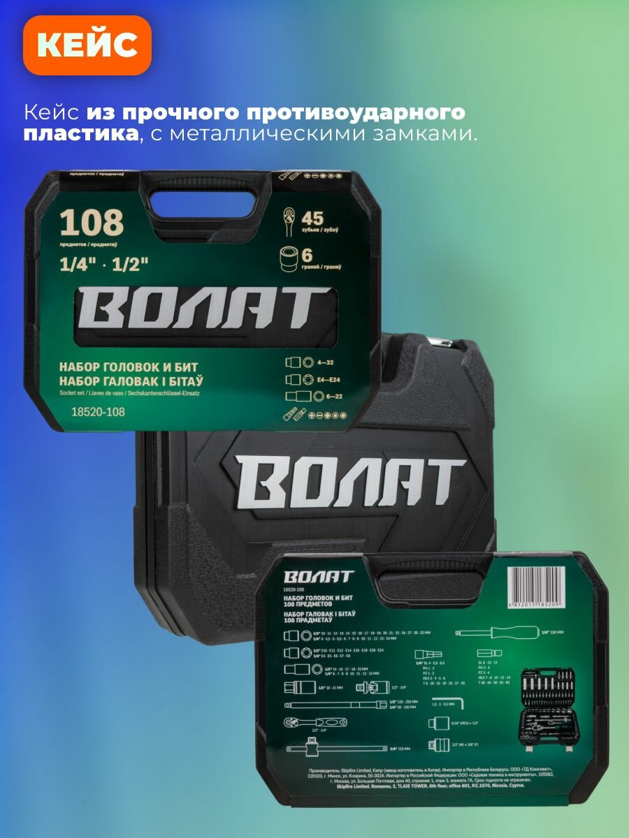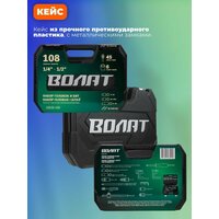 Набор головок и бит 108 предметов волат (1/4", 1/2", 6 граней) - это многофункциональный инструмент, предназначенный для ремонта и обслуживания автомобиля.