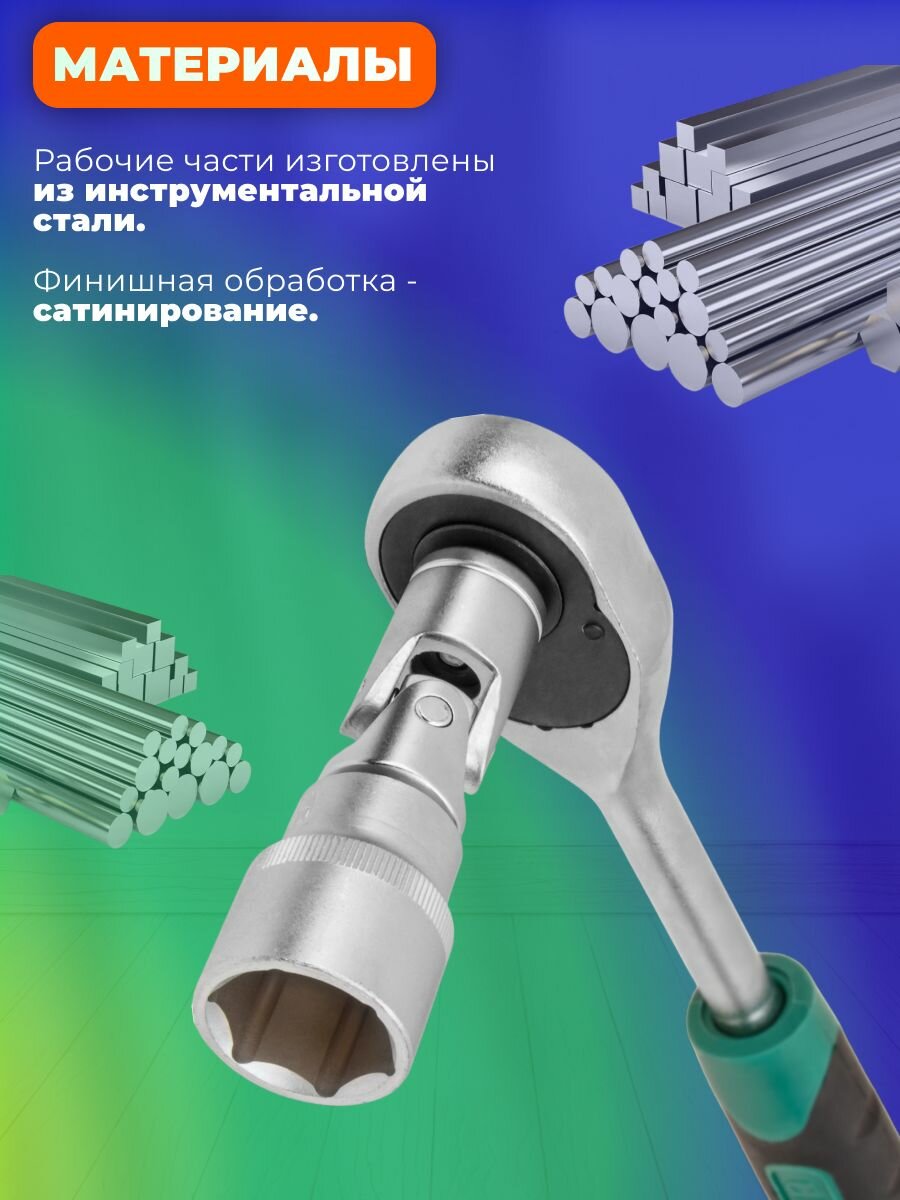 Трещоточный механизм с 45 зубьями обеспечивает удобство и точность работы, а также позволяет работать в труднодоступных местах. В комплекте с набором идет прочный противоударный пластиковый кейс с металлическими замками, что обеспечивает безопасное хранение и транспортировку инструмента.