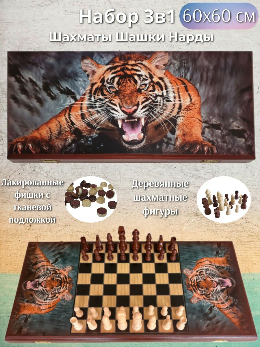 Представляем вашему вниманию набор игр шахматы, шашки, нарды "Тигр" — идеальный выбор для любителей настольных игр. Этот набор игр шахматы, шашки, нарды станет отличным подарком мужчине на день рождения, Новый год, 23 февраля или любой другой праздник.