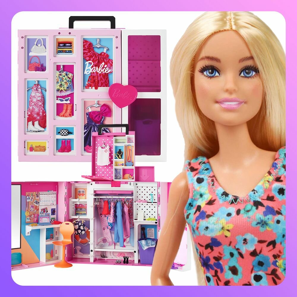 Гардероб мечты Barbie вдохновляет детей на создание бесконечных образов! Этот современный розовый шкаф имеет более 15 мест для хранения, включая выдвижную вешалку, которая создает второй этаж, желоб для корзин, зеркало в полный рост и место для стола. В комплект входит кукла Barbie, а также более 30 предметов одежды и аксессуаров. Можно использовать подставку для кукол и зеркало, чтобы наряжать куклу. Когда время игры закончится, набор можно взять с собой в дорогу – у него удобная ручка.
