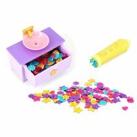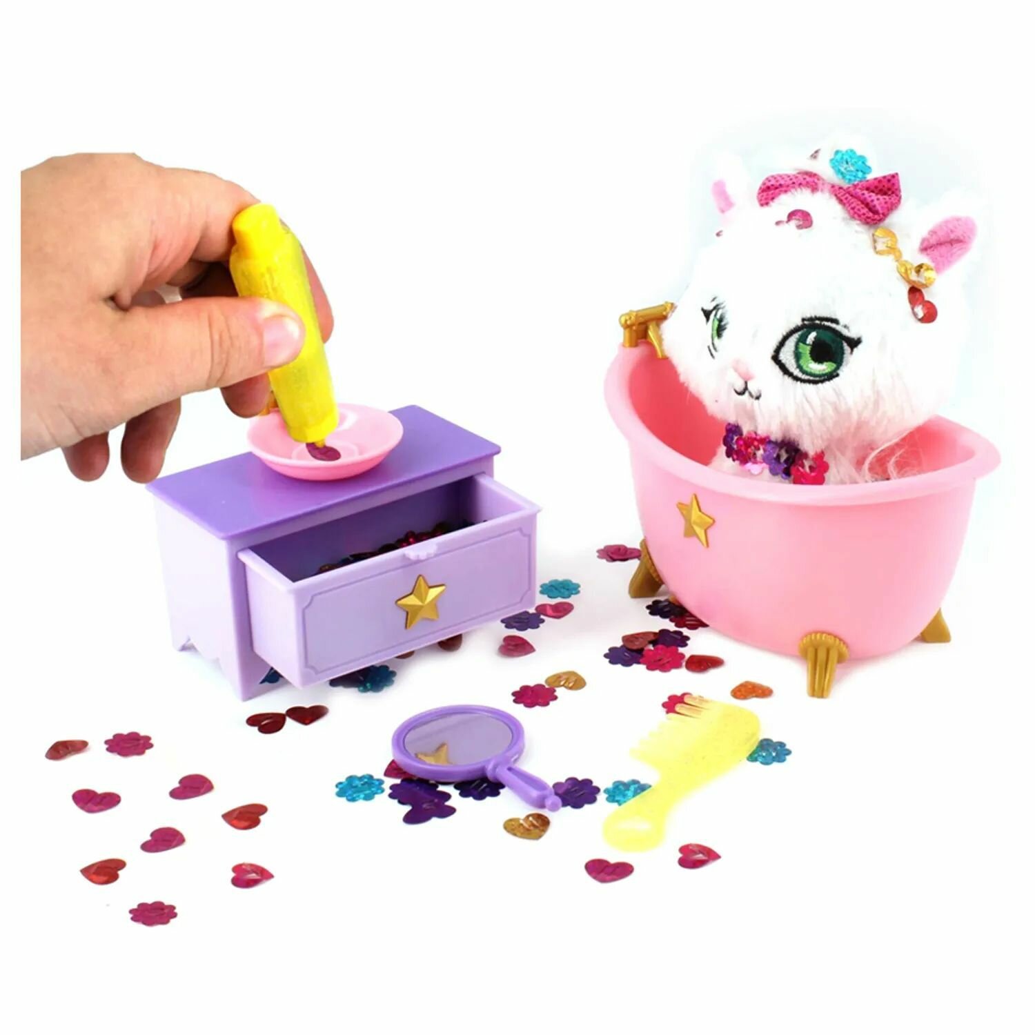 комплект: плюшевый черный котенок, шиммерайзер (аксессуар для хранения и нанесения блесток), 200+ блесток (светятся в темноте), расческа, 3 аксессуара, которые подойдут и для ребенка, и для игрушки: эластичная резинка с бантиком; сверкающий ошейник со звездочкой, который можно использовать как браслет; юбочка для питомца, которую можно использовать как аксессуар для волос