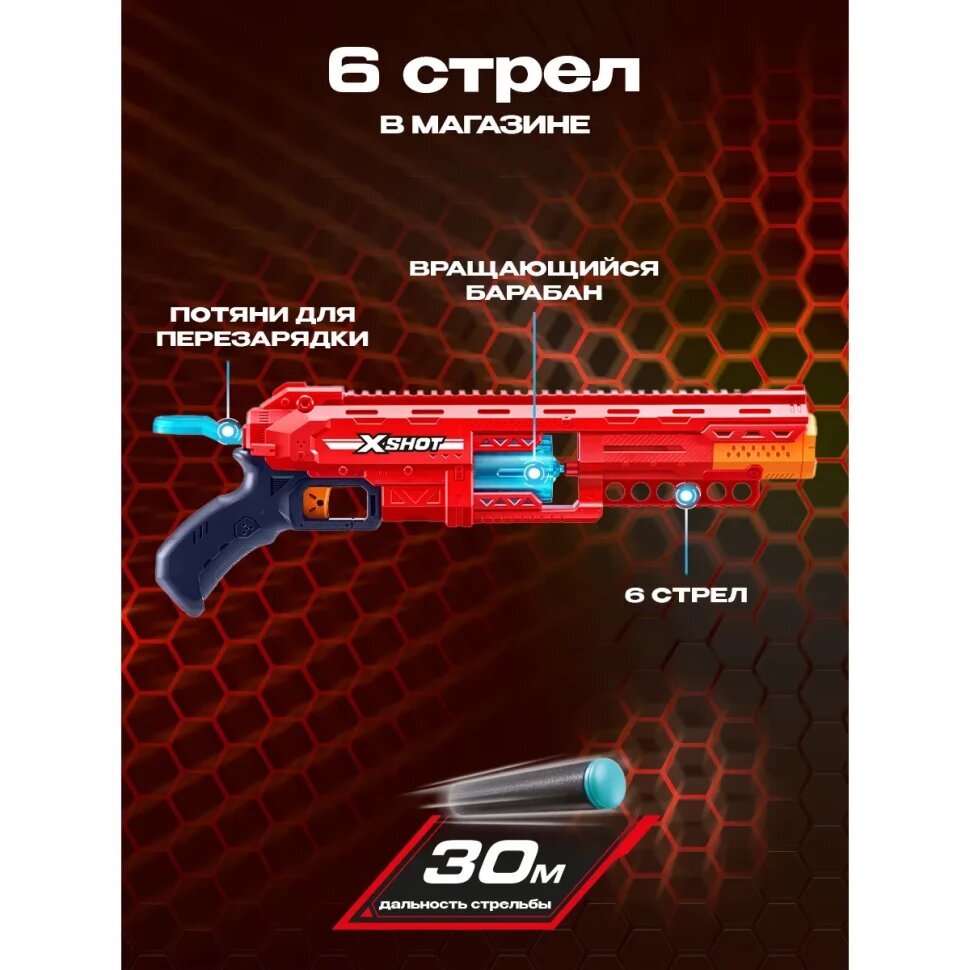 **Особенности набора:** - **Вращающийся ствол**: Бластер X-Shot Excel Caliber позволяет выпустить 6 стрел всего за несколько секунд, что дает вам значительное преимущество в игре. - **Дополнительное хранилище**: В комплект входит дополнительное место для хранения 6 стрел, чтобы вы всегда были готовы к действиям. - **Дальность стрельбы до 27 метров**: С точными стрелами вы легко сможете поражать цели на больших расстояниях, превращая любую игру в настоящее сражение. - **Технология Air Pocket**: Стрелы из пенопласта с уникальной технологией обеспечивают дальний и точный выстрел, что способствует развитию меткости и координации.