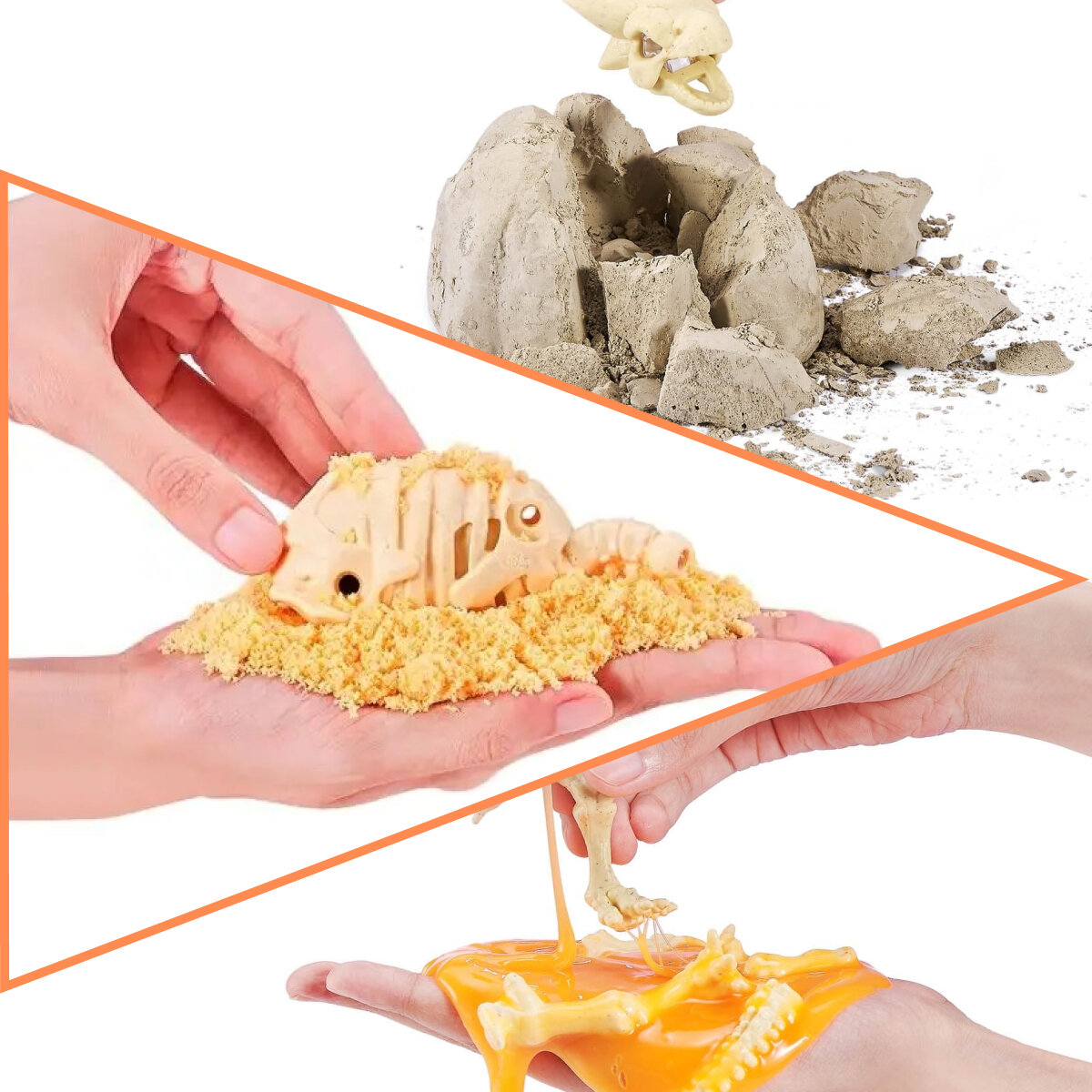 среднее яйцо, части динозавра для сборки, съемный молоточек для раскопок, «гипс» для раскопки, слайм, кинетический песок