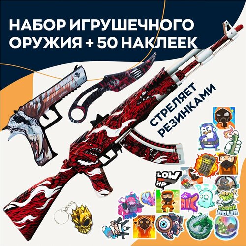 Представляем Вашему вниманию уникальный набор детского игрушечного оружия, в который входит: автомат Scylla, пистолет desert eagle Dust devil, нож фанг Haunt и набор наклеек. Весь набор выполнен из дерева, что делает его надежным и прочным. Каждый предмет обладает оригинальным дизайном из онлайн игры. Деревянный ножик fang - это прекрасная игрушка для детей любого возраста. Он представляет собой тренировочный нож. Резинкострелы автомат а и пистолет дигл способны стрелять резинками на расстояние до нескольких метров. Детские игрушки для мальчиков от это прекрасный подарок для мальчика на День рождение, 23 Февраля или любой другой праздник.