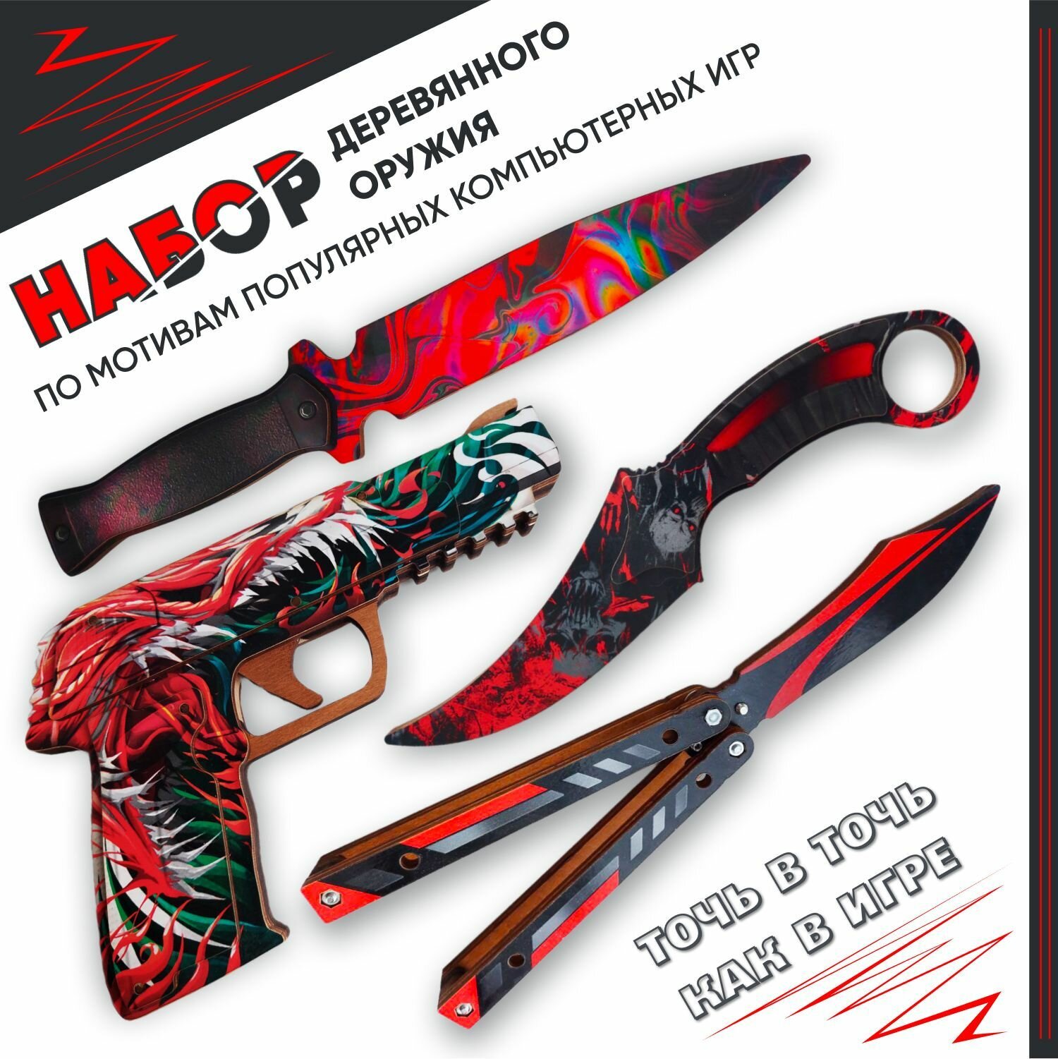 Набор игрушечных ножей PlayOffline «Пистолет резинкострел», «Фанг нож», «cnbu нож», «Нож бабочка», деревянные, для подвижных игр: сравнение цен, характеристики, фото, актуальное наличие и цены.