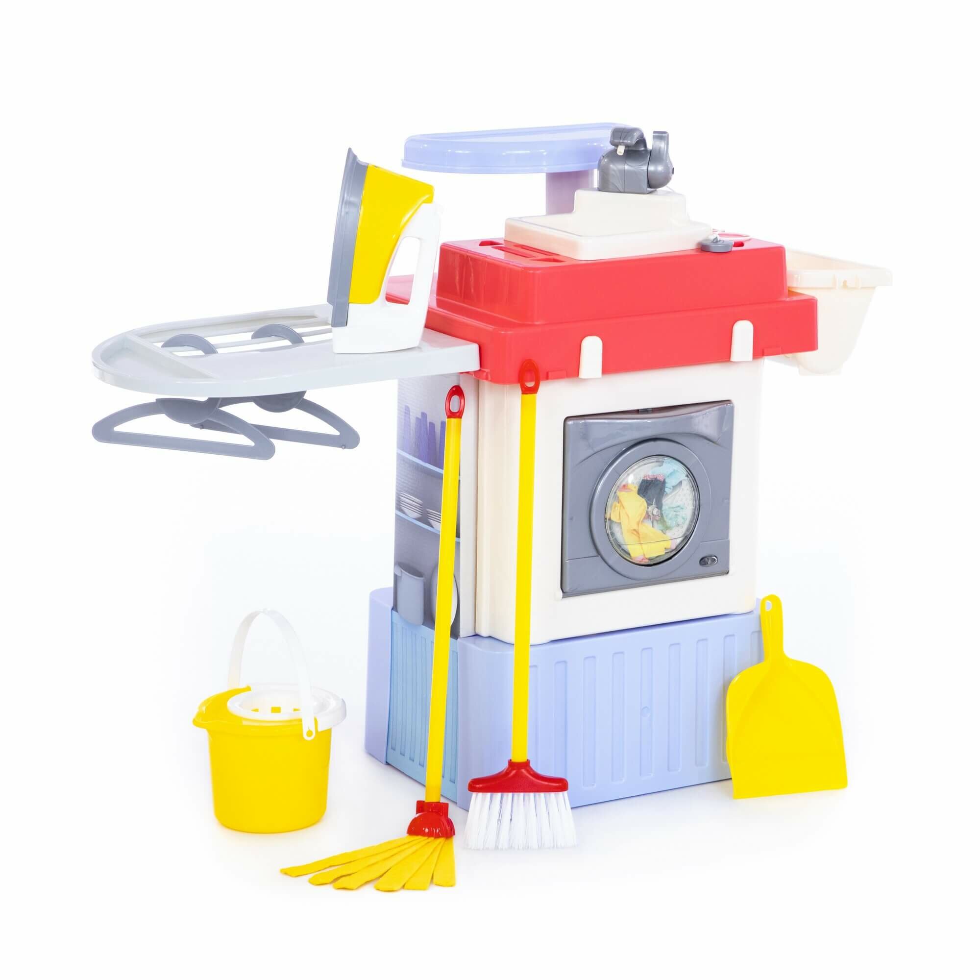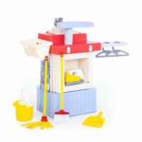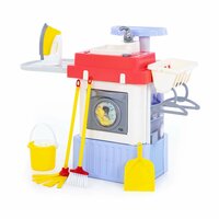В комплекте вы найдете имитацию стиральной машины с электронным приводом, гладильную поверхность, утюжок, кран с мойкой, веник, ведро с отжимом, швабру, совок, вешалки для одежды и ниши для кухонной утвари.