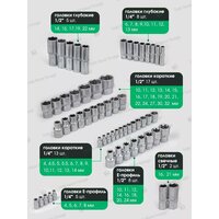 Набор инструментов очень удобен для профессионального механика и большинства домашних ремонтных работ. Этот набор инструментов изготовлен из высококачественной хромованадиевой стали. Включает самые необходимые инструменты для любого типа ремонта автомобиля, включая свечи зажигания, тормоза и обслуживание двигателя. Может использоваться для большинства механических операций, включая замену масла и обслуживание автомобилей. Головки и гаечные ключи совместимы с наборами инструментов других производителей. Отличный набор инструментов из 108 предметов, чтобы взять с собой в дорогу. Посадочный квадрат: 1/2" и 1/4". Все инструменты надежно хранятся в пластиковом кейсе с металлическими защелками, который обеспечивает удобную и компактную транспортировку. Комплектация набора идеально подходит для автолюбителей, автомастерских и сервисных центров. Min размер головки: 4 мм. Max размер головки: 32 мм. Min размер головки (дюйм): нет. Max размер головки (дюйм): нет. Тип головок: 6-гранные; Е-тип; биты. Количество в наборе: 108 шт. Присоединительный размер: 1/4 + 1/2 дюйма. Количество граней: 6. Размер посадки головки: 1/4; 1/2 дюйма. Система измерения: метрическая. Вес молотка: нет г. Комбинированные ключи: нет. Клещи: нет. Хвостовик бит: 5/16 (тип C)/1/4 квадрат. Трещотка: есть. Т-образный вороток: есть. Посадочный размер трещотки: 1/4; 1/2 дюйма. Torx: бита/головка. Свечной ключ: нет. Свечные головки: 16 мм/21 мм. Вид упаковки: кейс. Материал упаковки: пластик. Класс товара: Полупрофессиональный. Вес нетто: 7.141 кг. Дюймовые головки в комплекте: нет. Тип ключа: шестигранные. Съемник масляного фильтра: нет. Сталь: Cr-V. Комплектация: Головки 1/4" короткие 25 мм 4, 4.5, 5, 5.5, 6, 7, 8, 9, 10, 11, 12, 13, 14 мм, Головки 1/4" глубокие 50 мм 6, 7, 8, 9, 10, 11, 12, 13 мм, Головки 1/4" Е-профиль короткие 25 мм Е4, Е5, Е6, Е7, Е8, Головки-биты 1/4" HEX 35 мм 3, 4, 5, 6 мм, Головки-биты 1/4" TORX 35 мм T8, T10, T15, T20, T25, Т27, T30, Головки-биты 1/4" SL 35 мм 4, 5.5, 6,5, Головки-биты 1/4" РН 35 мм РН.1, РН.2, Головки-биты 1/4" PZ 35 мм PZ.1, PZ.2, Трещотка 1/4", Рукоятка 1/4" 150 мм, Вороток Т-образный 1/4" 115 мм, Удлинители 1/4" 50 и 100 мм, Кардан шарнирный 1/4", Биты 5/16" HEX 30 мм 7, 8, 10, 12, 14 мм, Биты 5/16" TORX 30 мм Т40, Т45, Т50, Т55, Т60, Биты 5/16" SL 30 мм 8, 10, 12, Биты 5/16" PH 30 мм PH.3, PH.4, Биты 5/16" PZ 30 мм PZ.3, PZ.4, Головки 1/2" короткие 38 мм 10, 11, 12, 13, 14, 15, 16, 17, 18, 19, 20, 21, 22, 24, 27, 30, 32 мм, Головки 1/2" глубокие 77 мм 14, 15, 17, 19, 22 мм, Головки 1/2" Е-профиль короткие 38 мм Е10, Е11, Е12, Е14, Е16, Е18, Е20, Е24, Головки свечные 1/2" 16, 21 мм, Трещотка 1/2", Удлинители 1/2" 125 и 250 мм, Кардан шарнирный 1/2", Адаптер с отверстием с 3/8"(F)х1/2"(M), Битодержатель 1/2"(F)х5/16"(F), Ключи Г-образные 6-гранные короткие 1.5, 2, 2.5 мм, Кейс.
