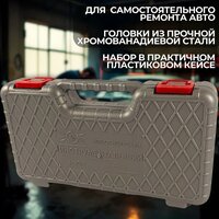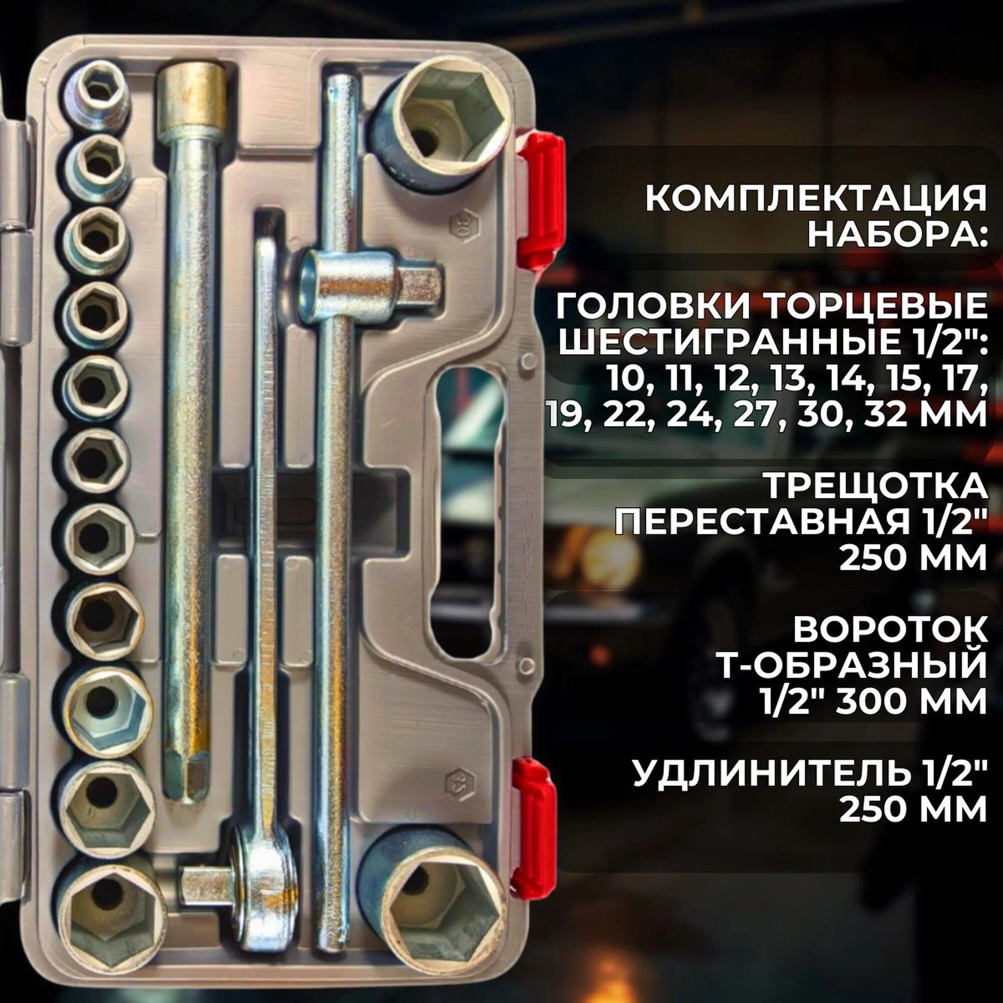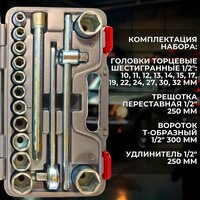Набор включает в себя 18 предметов, включая торцевые головки 1/2" с размерами от 10 до 32 мм, трещотку, вороток Т-образный и удлинитель. Все инструменты изготовлены из хромованадиевой инструментальной стали методом горячей штамповки (ковки на молотах), что обеспечивает их прочность и долговечность.