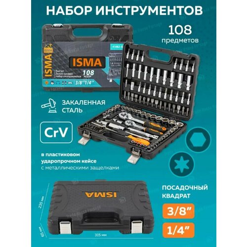 Профессиональный набор инструментов ISMA из 108 предметов - удачный выбор для выполнения монтажных, слесарных и ремонтных работ. Набор имеет ряд достоинств, которые облегчают выполнение работ при обслуживании и ремонте автомобиля. В представленный набор инструментов 108 предметов входят множество типоразмеров торцевых насадок и бит, а так же Т-образный вороток и битодержатели двух размеров. Все торцевые головки, трещотки, воротки, карданы и удлинители изготовлены из прочной легированной стали, которая обладает повышенной устойчивостью к коррозии. Посадочный квадрат: 3/8", 1/4". Тип головок: 6-гр, Е-профиль, короткие, глубокие.
