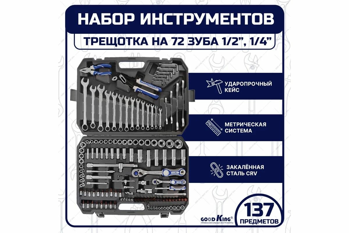 | Головки торцевые подробно | 1/2": 8, 10, 11, 12, 13, 14, 15, 16, 17, 18, 19, 21, 22, 24, 27, 30, 32 мм; E-стандарт 1/2": E10, E11, E12, E14, E16, E18, E20, E22, E24; удлинённые 1/4": 6, 7, 8, 9, 10, 11, 12, 13 мм; свечные 1/2": 16, 21 мм; удлинённые 1/2": 14, 15, 17, 19, 22 мм; торцевые головки E-стандарт 1/4": E4, E5, E6, E7, E8; 1/4": 4, 4.5, 5, 5.5, 6, 7, 8, 9, 10, 11, 12, 13, 14; с наконечниками 1/4": удлинённые крестообразные Pozidriv: PZ1, PZ2, PZ3, шестигранные Femelle Hexagon HEX: H3, H4, H5, H6, прямой шлиц Slot: S4, S5.5, S6.5, биты-звёздочки TORX: T10, T15, T20, T25, T30, крестообразные Phillips: PH1, PH2, PH3 |