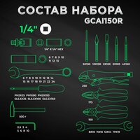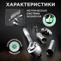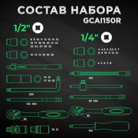 | Головки торцевые подробно | 1/2": 8, 9, 10, 11, 12, 13, 14, 15, 16, 17, 18, 19, 20, 21, 22, 23, 24, 27, 30, 32 мм; Torx 1/2": E10, Е12, Е14, Е16, Е18, Е20; 1/4": 4, 4,5, 5, 5,5, 6,7,8,9,10,11,12,13 мм; Torx 1/4": E4, Е5, Е6, Е7,Е8; длинные 1/2": 14, 15, 17, 19, 22 мм; длинные 1/4": 6, 7, 8, 9, 10, 11, 12, 13 мм; свечные 1/2": 16, 21 мм; удлинитель 1/4": 50, 100 мм; гибкий удлинитель 1/4": 150 мм; вороток т-образный 1/4"; карданный шарнир 1/4"; удлинитель 1/2": 125, 250 мм; карданный шарнир 1/2"; вороток L-образный 1/2": 260 мм; вороток с шарниром 1/2": 380 мм |