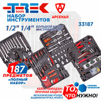 Большой набор инструментов в чемодане с защитой углов на колесиках. Все предметы из представленного набора изготовлены из высококачественной углеродистой стали, хромоникелевое матовое покрытие для защиты от коррозии. Данный комплект станет прекрасным помощником для выполнения широкого спектра ремонтных и монтажных работ для дома, дачи, а также обслуживание автомобиля и любой другой техники. Ударопрочный металлический кейс на колесиках, с телескопической ручкой.