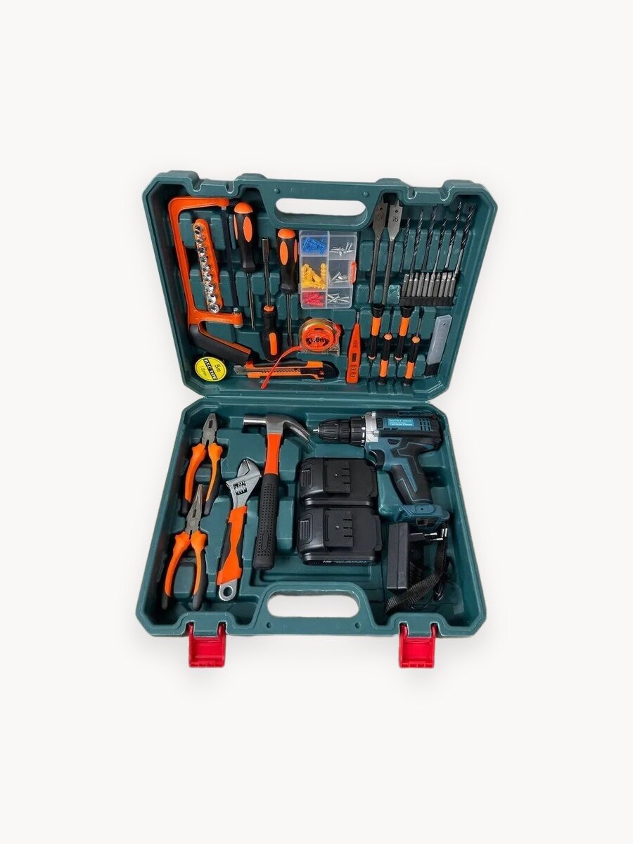 Комплектация -Шуруповерт -2 аккумулятора 26 вольт 6.0 AH -молоток -щипцы -плоскогубцы -разводной гаечный ключ -пила -изолента - набор насадок для болтов -три большие отвертки -рулетка\метр -набор дюбелей и саморезов -набор малых отверток -индикаторная отвертка -сменные лезвия для ножа -два перьевых сверла по дереву -набор сверл -набор бит