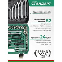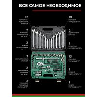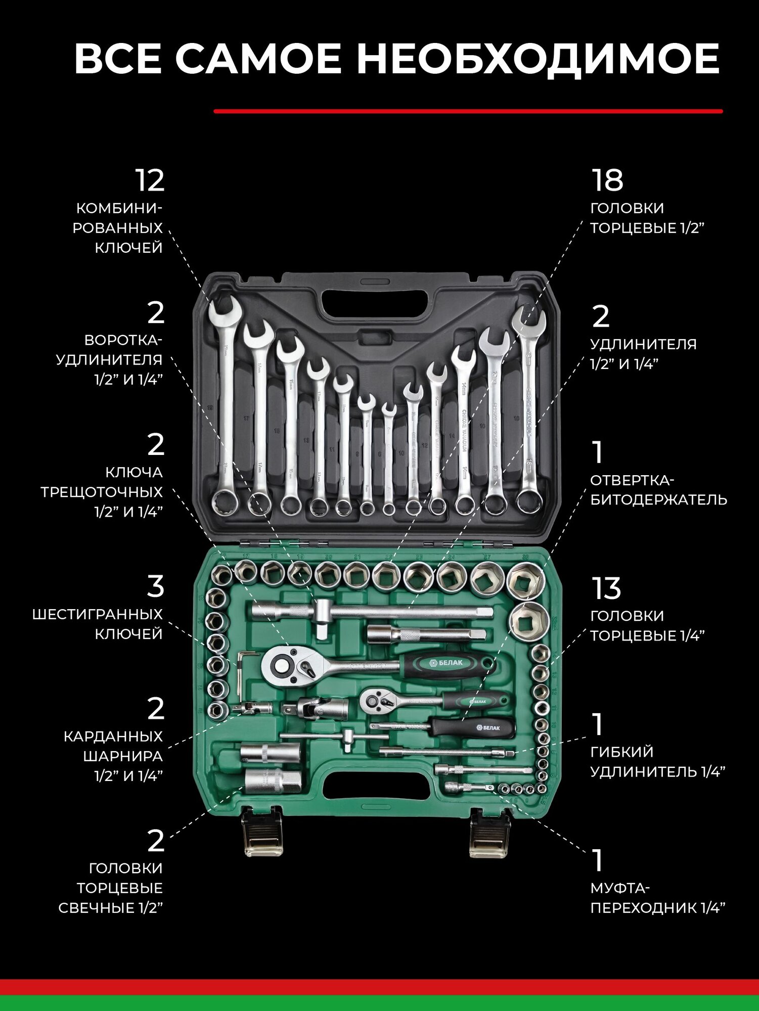 Высокое качество всех элементов набора для автомобиля порадует автомобилиста любого стажа и квалификации, а универсальность комплектации позволит использовать набор как инструменты для дома, машины и других видов ремонта. Набор торцевых головок, бит, ключей имеет высокие показатели твердости, что говорит о долгом сроке службы и устойчивости к сильным нагрузкам, за счет чего, данный комплект можно использовать как профессиональный инструмент для автосервиса.