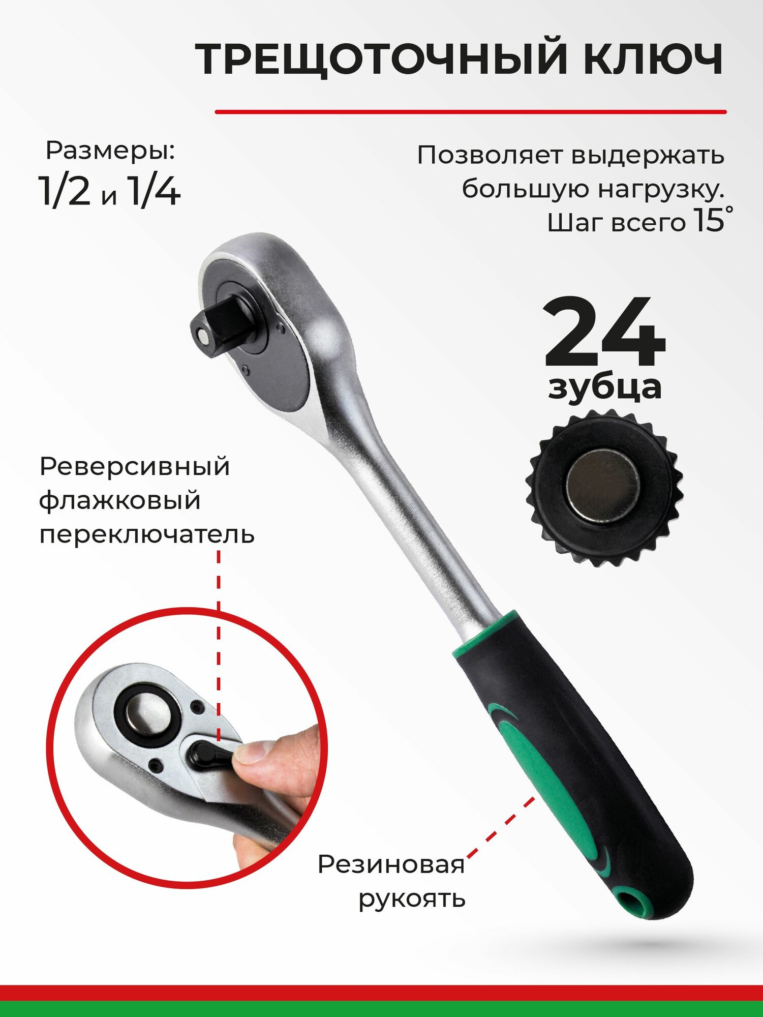 Набор 61 предмет автомобильный для ремонта выполнен из специальной комплексно легированной стали с повышенным содержанием углерода. Прочные металлические замки и эргономичный ударопрочный кейс чемодан, делают набор головок с трещоткой эффективным и мобильным.