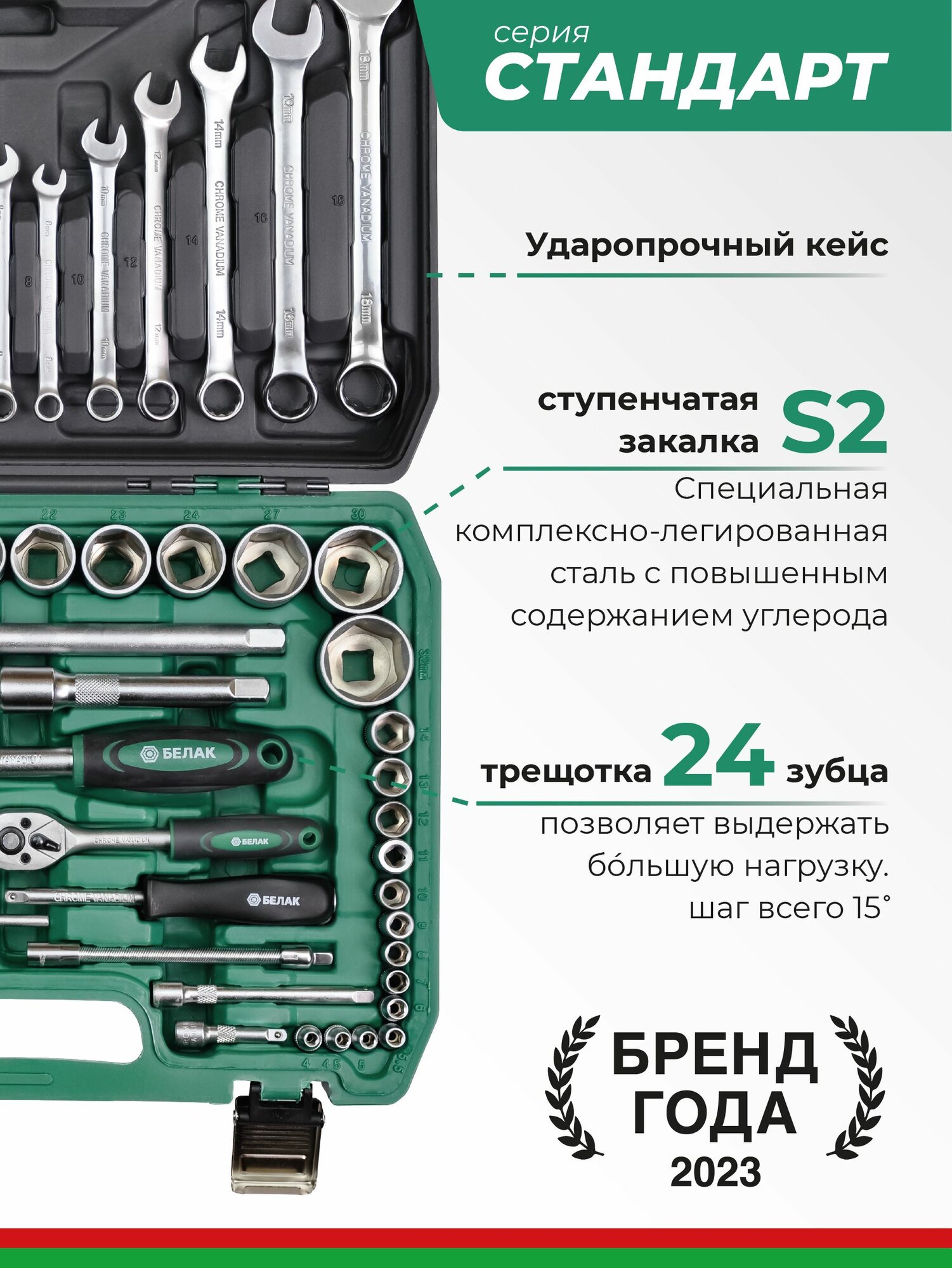 Набор ключей для автомобиля серии "Стандарт" разработан производителем БелАК, награжденным десятью национальными премиями "Автокомпонент года". Универсальный набор ключей с трещоткой предназначен для крепежных работ дома, на даче, в автомастерской, для гаража.