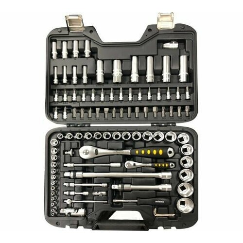 | Дополнительная информация | комплектация: 1/4" торцевые головки ; 3/8" торцевые головки ; 1/2" торцевые головки; 1/4" удлиненные торцевые головки; 1/2" удлиненные торцевые головки.; 1/2" головки Е-типа; 3/8" свечные головки с магнитом; 1/2" свечная головка с магнитом; 1/4"; 1/2" и 3/8" карданные шарниры - 3; 3/8" удлинители для головок – 100 и 175 мм - 2; 1/2" Удлинители для головок – 155 и 280 мм - 2; 1/4"M – 3/8"F адаптер; 1/2"М – 3/8"F адаптер; 1/4" адаптер для бит - 3; набор бит в пластиковом держателе; 1/4"F×1/4"M диск; 1/4" отвертка-держатель – 150 мм; 1/4" трещоточный ключ – 72 зубца; 3/8" трещоточный ключ – 72 зубца; 1/2" трещоточный ключ – 72 зубца; набор шестигранных ключей; набор имбусовых шестигранных ключей с держателем; комбинированные ключи; ударные отвертки; телескопическая рукоятка с зеркалом; отвертка-тестер; универсальный съемник масляных фильтров; кейс |