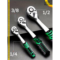 В комплект входят вороток для головок, ключ переставной гаечный, трещотка, биты, торцевые головки, гибкий удлинитель для бит и головок, головка-держатель для бит, держатель для бит, 40 бит с посадкой 1/2" и 1/4", 79 торцевых головок, свечные и удлинённые головки, а также 6-гранные наконечники.
