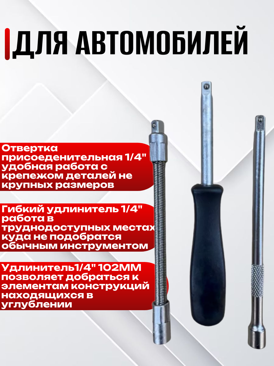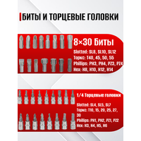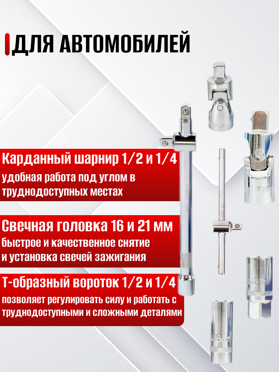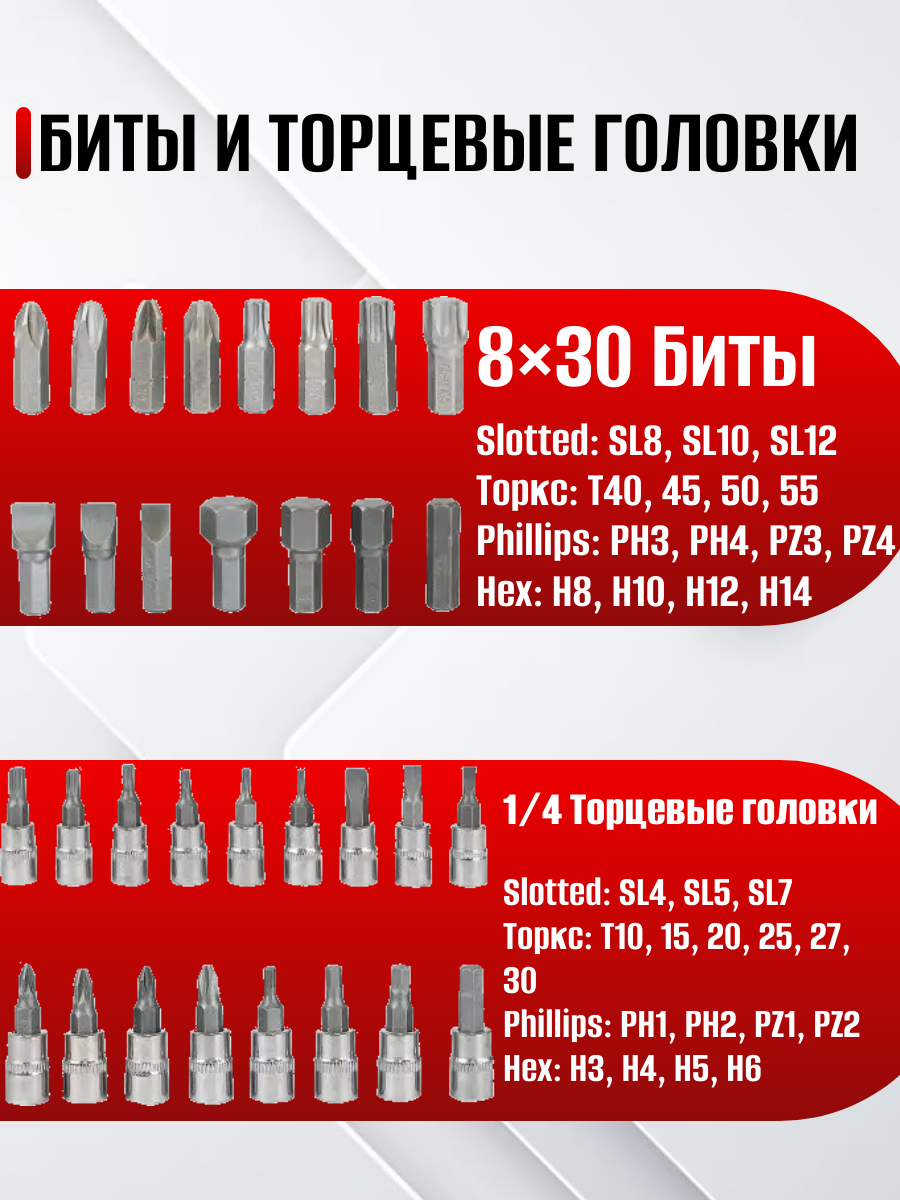 Для дома и авто: этот универсальный набор инструментов идеально подходит для ремонта в доме или в автомобиле, обеспечивая профессиональный результат. Удобный кейс обеспечивает надежное и крепкое хранение всех инструментов. Дополнительно служит для легкости переноски и организации рабочего пространства. Ключи комбинированные 9 шт: 8, 10, 11, 12, 13, 14, 17, 19, 22 мм; Головки торцевые 1/4" 13 шт: 4, 4.5, 5, 5.5, 6, 7, 8, 9, 10, 11, 12, 13, 14 мм; Головки торцевые 1/2" 12 шт: 14, 15, 16, 17, 18, 19, 20, 21, 24, 27, 30, 32 мм; Биты 1/4" (17шт.): T8, Т10, Т15, Т20, Т25, Т30, SL4, SL5.5, SL7, PZ1, PZ2, H3, H4, H5, H6, PH1, PH2; Биты 8мм (15 шт.): H8, H10, H12, H14, SL8, SL10, SL12, Т40, Т45, Т50, Т55, PH3, PH4, Pz3, Pz4; Головки на свечу зажигания 1/2" (2 шт.): 16 и 21 мм; Удлинитель 1/4"(2 шт.): 50 и 100 мм; Удлинитель гибкий ¼" L=150 мм; Удлинитель/стержень поворотный со смещаемым торцевым ключом 1/2" 250 мм; Удлинитель 1/2" 125 мм; Стержень поворотный со смещаемым торцевым ключом 1/4" 115 мм; Отвертка вороток 1/4" 150 мм; Карданный шарнир 1/4"; Карданный шарнир 1/2"; Ключ трещоточный реверсивный с быстрым сбросом 1/4" 24 зубчика 150 мм; Ключ трещоточный реверсивный с быстрым сбросом 1/2" 24 зубчика 250 мм; Переходник с биты 5/16 на 1/2"DR; Переходник с биты 1/4 на 1/4"DR."