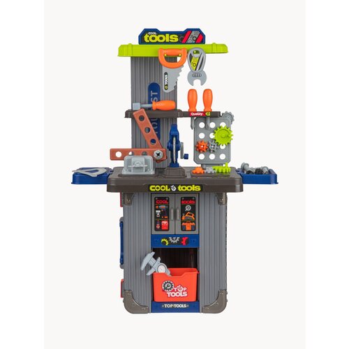 - Верстак детский с интерактивными функциями: крутится диск пилы, шестерёнки легко вращаются, тиски зажимаются с помощью винта.