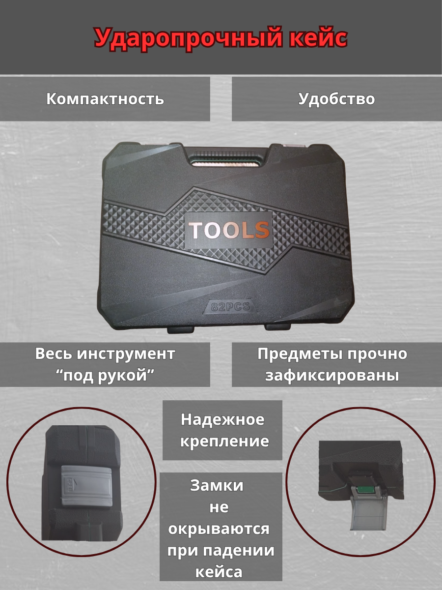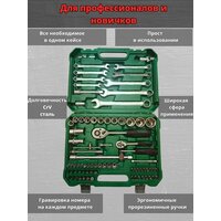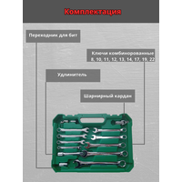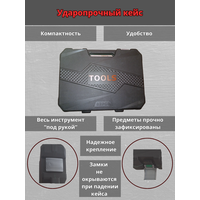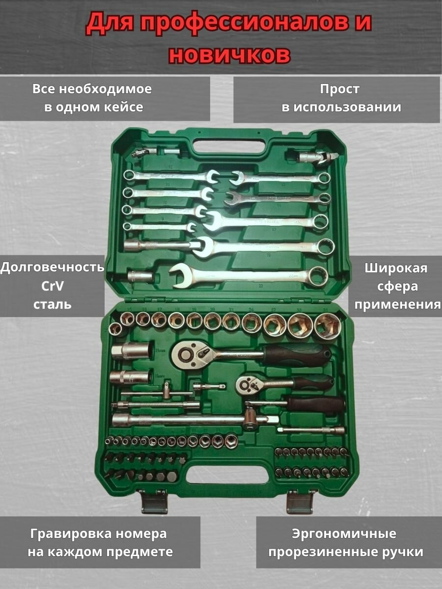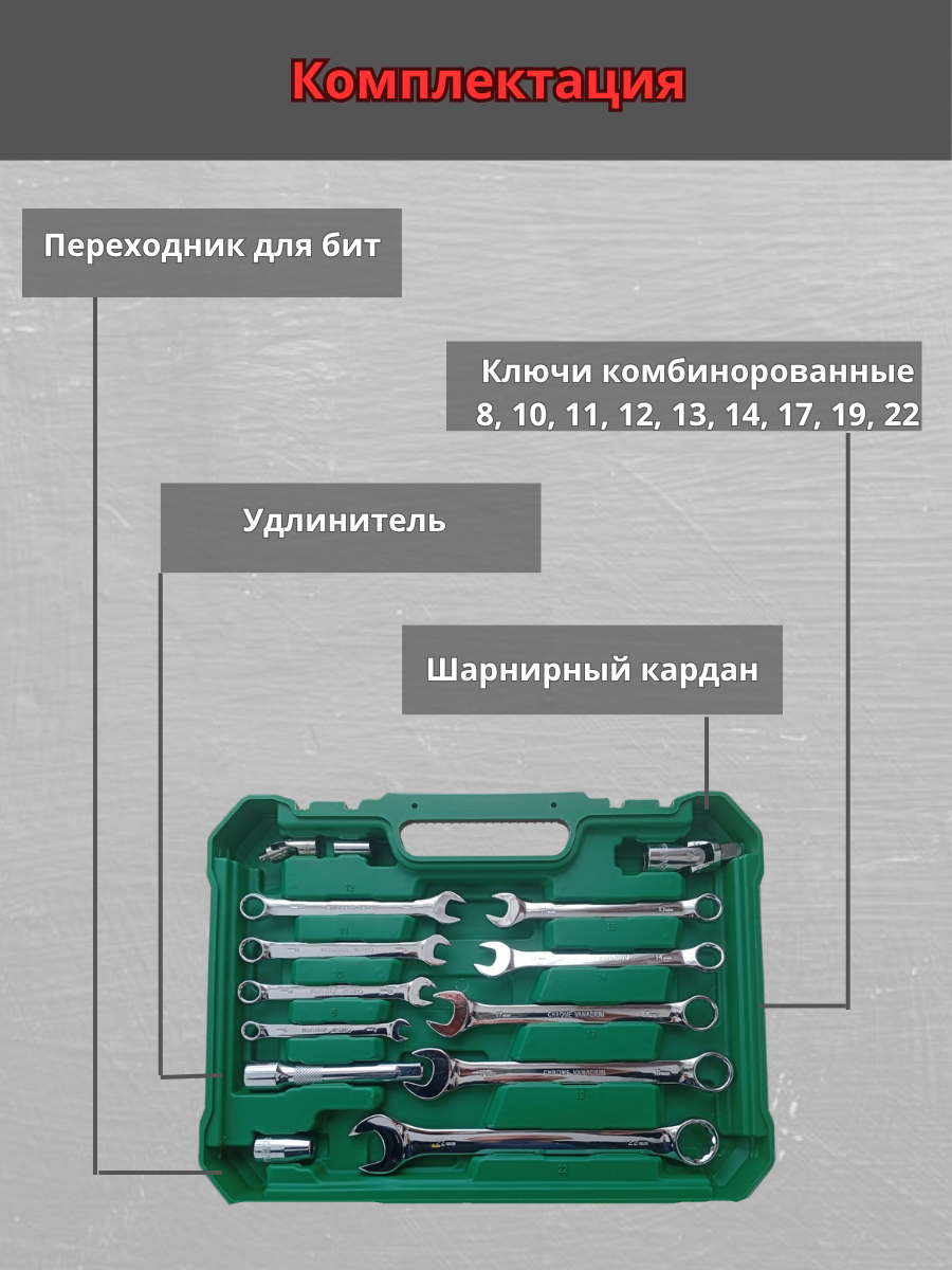 | Подробная комплектация | Привод 1/4": Шестигранные головки 13 штук: 4, 4.5, 5, 5.5, 6, 7, 8, 9, 10, 11, 12, 13, 14 мм Биты (длина 32 мм), 17 штук: Биты HEX, 4 штуки: 3, 4, 5, 6 мм Биты шлицевые, 3 штуки: 4, 5.5, 7 мм Биты TORX, 6 штук: T8, T10, T15, T20, T25, T30 Биты PHILLIPS, 2 штуки: PH.1, PH.2 Биты POZIDRIV, 2 штуки: PZ.1, PZ.2 Трещотка Вороток Т-образный Удлинители, 2 штуки: 50, 100 мм Кардан шарнирный Гибкий удлинитель Отвертка с квадратом Адаптер для бит 25 мм Привод 1/2": Шестигранные головки 12 штук: 14, 15, 16, 17, 18, 19, 20, 22, 24, 27, 30, 32 мм Трещотка Кардан шарнирный Удлинители, 2 штуки: 125, 250 мм Свечные головки, 2 штуки: 16 и 20.6 мм Адаптер для удлинителя 3/8"(F)x1/2"(M) Держатель для бит 1/2"DRx5/16" Биты 5/16" (30 мм), 15 штук: Биты HEX, 4 штуки: 8, 10, 12, 14 мм Биты TORX, 4 штуки: T40, T45, T50, T55 Биты шлицевые, 3 штуки: 8, 10, 12 мм Биты PHILLIPS, 2 штуки: PH.3, PH.4 Биты POZIDRIV, 2 штуки: PZ.3, PZ.4 Комбинированные ключи, 9 штук: 8, 10, 11, 12, 13, 14, 17, 19, 22 мм |