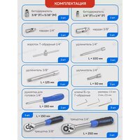 | Инструменты в комплекте | бокорезы, вороток для головок, выколотка, зубила, ключи гаечные, ключи имбусовые (шестигранные), ключи торцевые, кусачки, молоток, отвёртки, отвёртки для точных работ, пассатижи, плоскогубцы, рукоять для бит, рукоять для головок, трещотка |