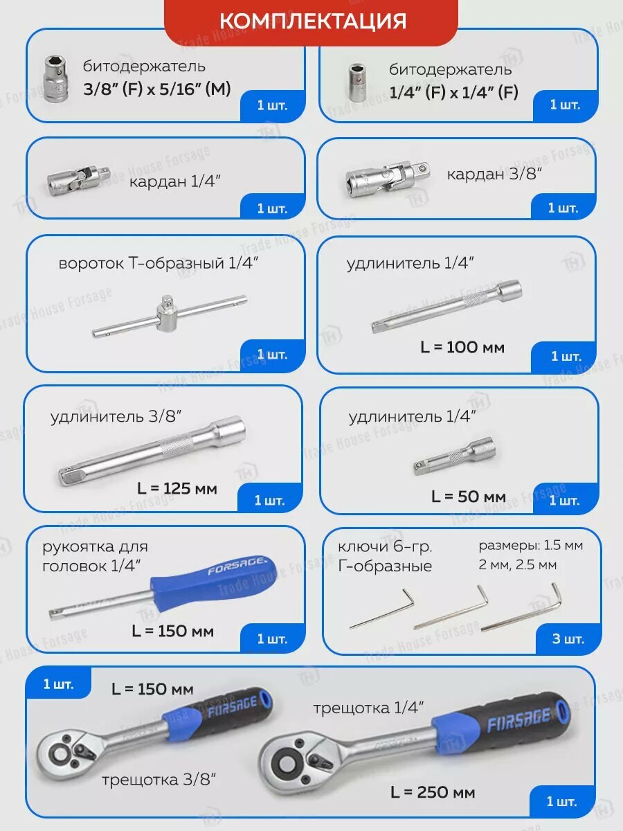 | Головки торцевые подробно | 1/4" короткие 25 мм: 4, 4.5, 5, 5.5, 6, 7, 8, 9, 10, 11, 12, 13, 14 мм; глубокие 50 мм: 6, 7, 8, 9, 10, 11, 12, 13 мм; Е-профиль короткие 25 мм: Е4, Е5, Е6, Е7, Е8; 1/2" короткие 38 мм: 10, 11, 12, 13, 14, 15, 16, 17, 18, 19, 20, 21, 22, 24, 27, 30, 32 мм ; глубокие 77 мм: 14, 15, 17, 19, 22 мм; Е-профиль короткие 38 мм: Е10, Е11, Е12, Е14, Е16, Е18, Е20, Е24; головки свечные 1/2": 16, 21 мм |