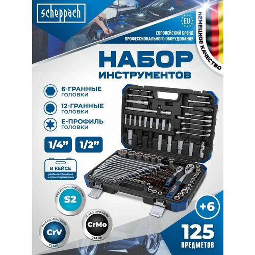 Профессиональный набор премиум качества Scheppach из 125+5 предметов (ключи накидные трещоточные и разрезные). Посадочный квадрат головок 1/4",1/2" Premium класса представляет собой обширный комплект инструментов, который можно использовать для ремонта на СТО, мастерских, в гараже, в дороге, дома в быту и т. д.