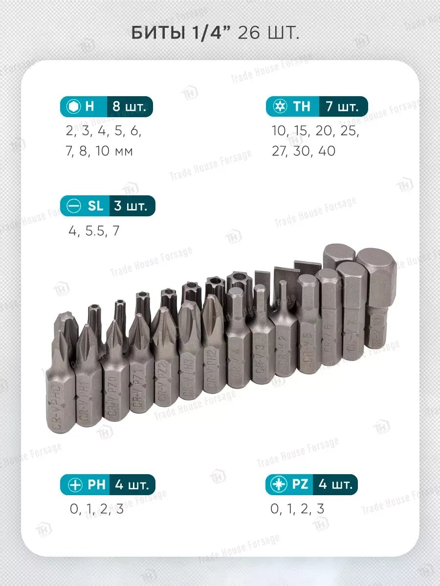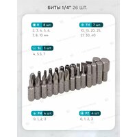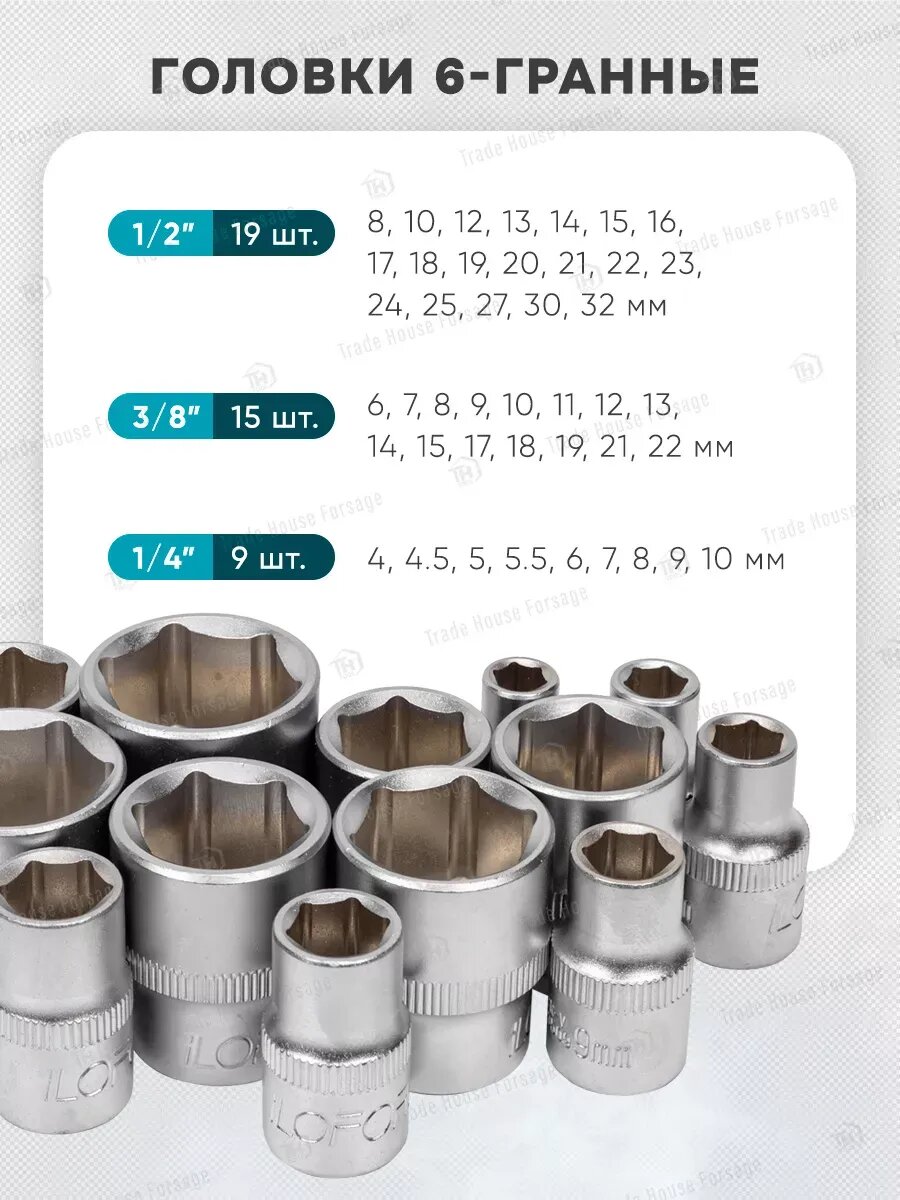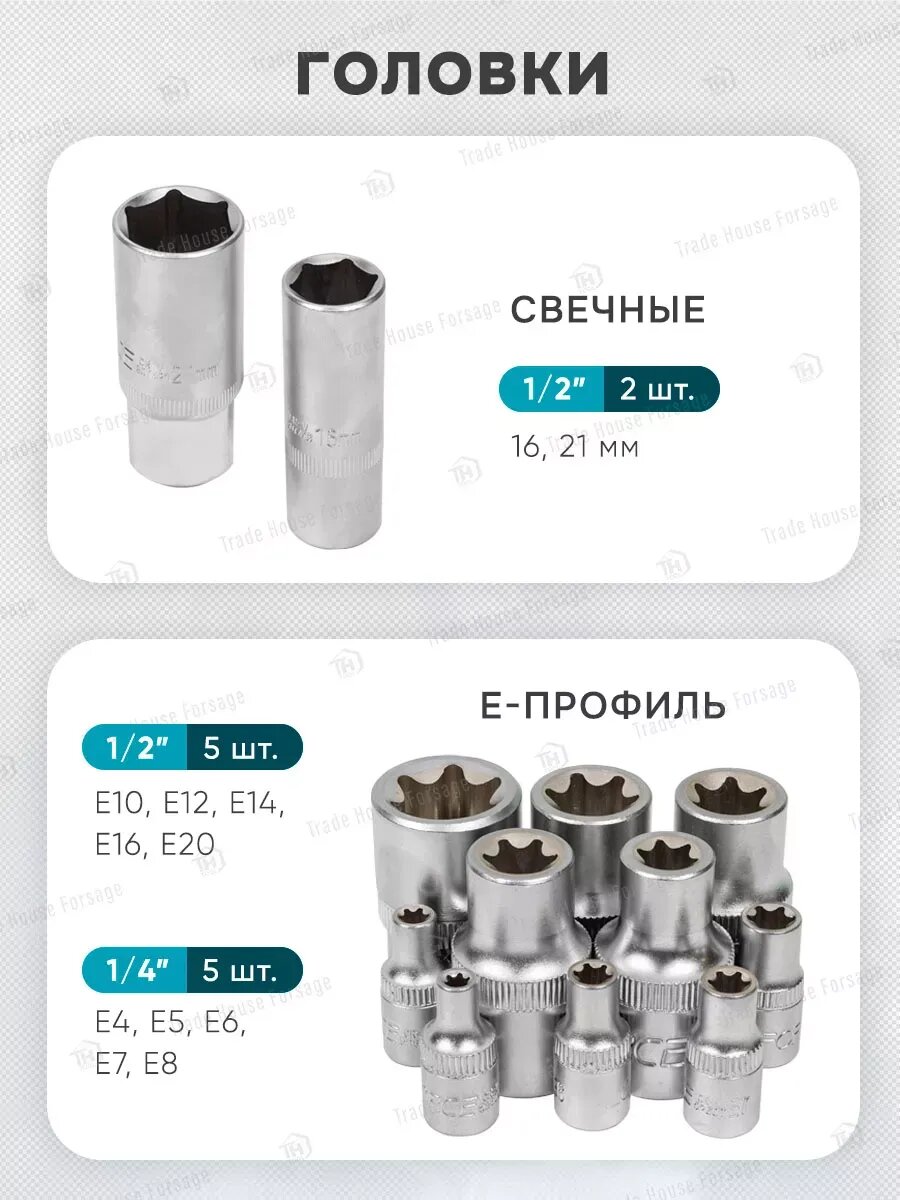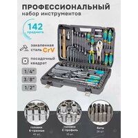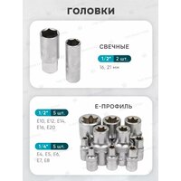 Комплектация: головки 1/4"; головки 1/4"Е-профиль; головки-биты 1/4"HEX; головки-биты 1/4"TORX ; головки-биты 1/4"SL; головки-биты 1/4"РН; головки-биты 1/4"PZ; трещотка 1/4"; вороток 1/4"Т-образный; рукоятка 1/4"; удлинители 1/4"; гибкий удлинитель 1/4"; кардан шарнирный 1/4"; головки 3/8"короткие; трещотка реверсивная шарнирная 3/8"; удлинители 3/8"; кардан щарнирный 3/8"; головки 1/2"короткие; головки 1/2"Е-профиль; головки свечные 1/2"; трещотка 1/2"; вороток 1/2"Г-образный; вороток шарнирный 1/2"; удлинители 1/2"; кардан шарнирный 1/2"; адаптер с 3/8"(F)*1/2"(M) с отверстием; адаптер с 3/8"(F)*1/4"(M) с отверстием; битодержатель 1/4"(F)*1/4"(F) (HEX); ключи шестигранные Г-образные; ключи разрезные; ключи комбинированные рожково-накидные; отвертки крестовые PН.1, PH.2; отвертки шлицевые SL.5.5*, SL.6.5*; отвертки силовые: PH.2*, SL.6.5*; плоскогубцы 7"; захват гейферный 10"; молоток с деревянной ручкой 300 гр. Пластиковый кейс с металлическими защелками.
