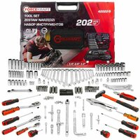 Набор FORCEKRAFT оснащен различными типами головок, бит, рукояток, трещоток, удлинителей, карданов, переходников, ключей, отверток, плоскогубцев, молотка и других необходимых инструментов.