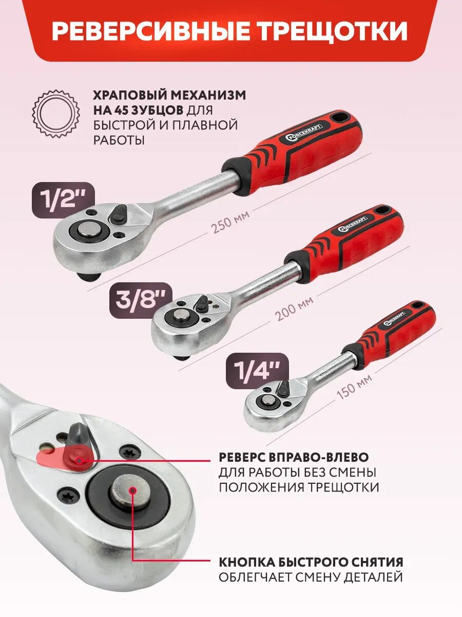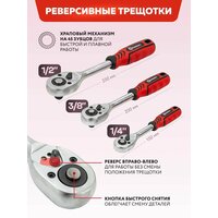 Широкий функционал: В комплект входят головки, биты, трещотки, карданы, удлинители, ключи, отвертки, съемники и другие необходимые элементы.