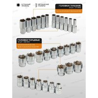 • Широкая комплектация. Включает 19 торцевых головок (8–32 мм) и 12 глубоких головок (10–24 мм), что позволяет справляться с большинством ремонтных задач, включая замену свечей зажигания и работу с различными крепежными элементами.