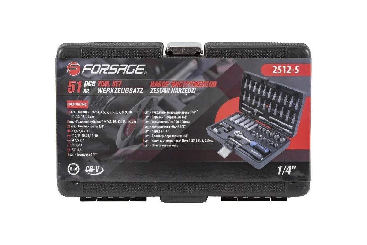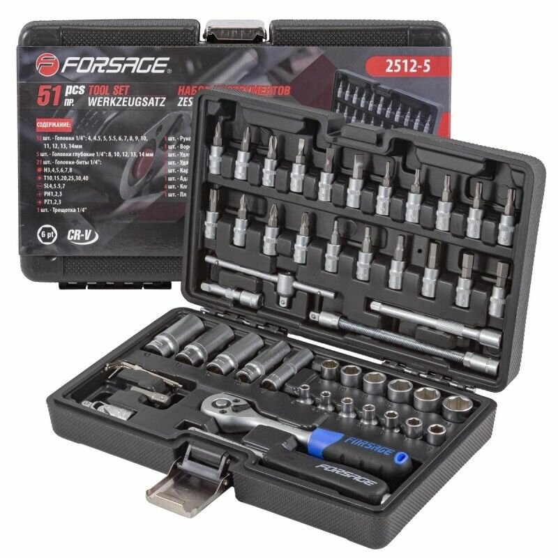 Набор инструментов Forsage 51пр, 1/4″ 4-14мм, 6-гран, F-2512-5(51928): сравнение цен, характеристики, фото, актуальное наличие и цены.