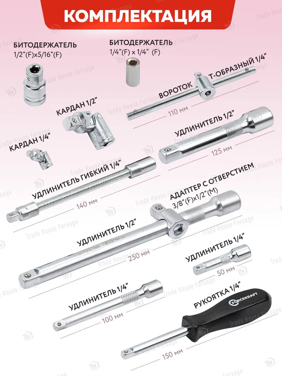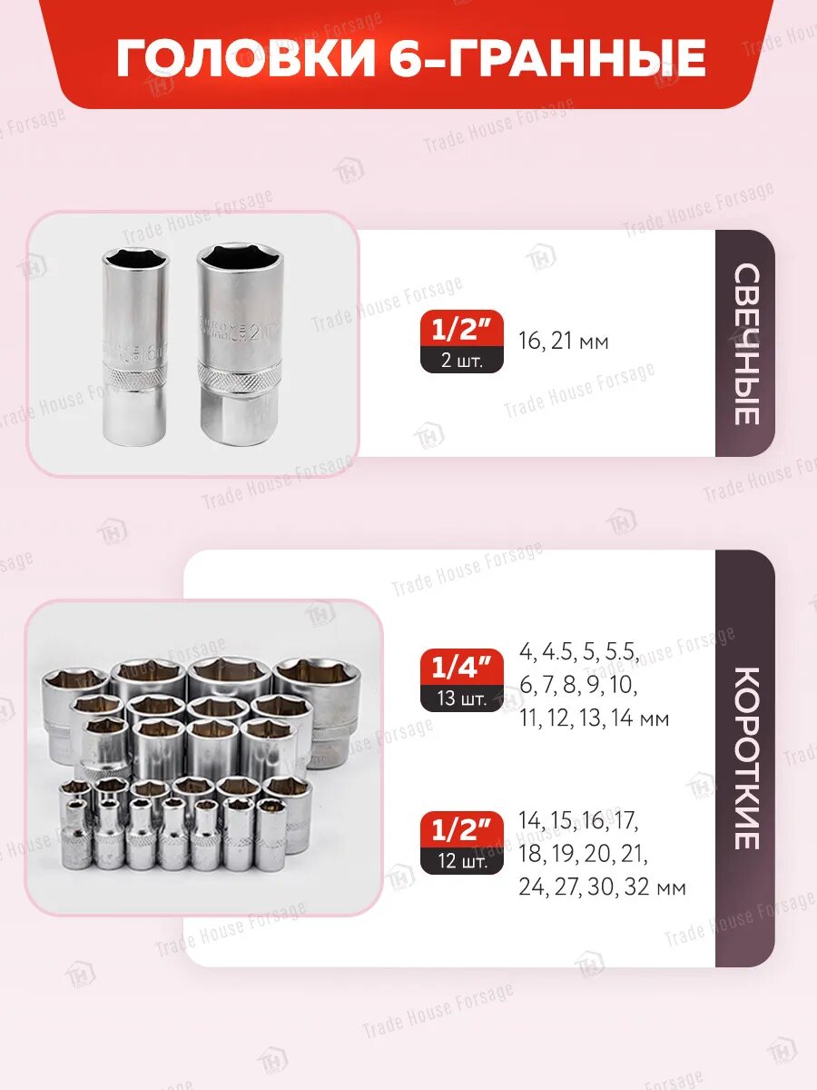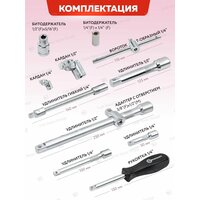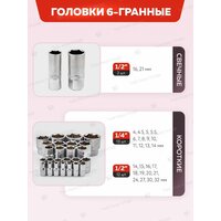 | Головки торцевые подробно | 1/2": 10, 11, 12, 13, 14, 15, 16, 17, 18, 19, 20, 21, 22, 24, 27, 30, 32 мм; длинные 1/2": 14, 15, 17, 19, 22 мм; свечные 1/2": 16, 21 мм; 1/4": 14, 4.5, 5, 5.5, 6, 7, 8, 9, 10, 11, 12, 13, 14 мм; длинные 1/4": 6, 7, 8, 9, 10, 11, 12, 13 мм |