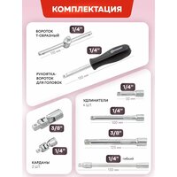 адаптер для коронок, бита-адаптер для торцевых головок, гибкий удлинитель для бит, гибкий удлинитель для головок, держатель для бит, нож, отвертка индикаторная, переходник для головок, телескопический магнитный щуп, удлинитель для бит, удлинитель для головок, фонарь, шарнир карданный для головок