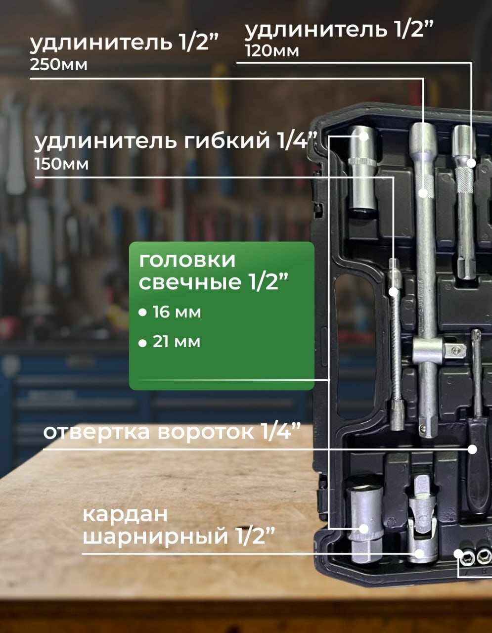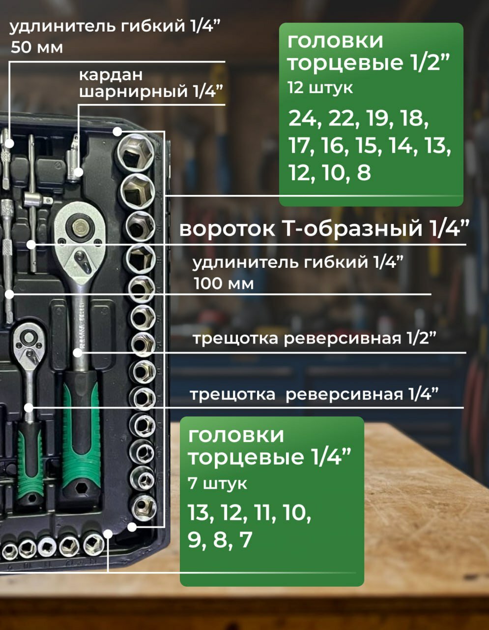 - трещотка: 1/4, 1/2; - вороток 1/4 с отвёрточной рукояткой;