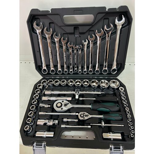 Ключи комбинированные (12 шт): 8, 9, 10, 11, 12, 13, 14, 15, 16, 17, 18, 19 мм; Головоки торцевые ¼" (13 шт): 4, 4.5, 5, 5.5, 6, 7, 8, 9, 10, 11, 12, 13, 14 мм; Головок торцевые ½" (18 шт): 10, 11, 12, 13, 14, 15, 16, 17, 18, 19, 20, 21, 22, 23, 24, 27, 30, 32 мм; Головки на свечу зажигания ½" (2 шт.): L=16 мм и L=21 мм; Удлинитель ½" (2 шт): L=125 и L=250 мм; Удлинитель ¼" (2 шт): L=50 и L=100 мм; Карданный шарнир ½"; Карданный шарнир ¼"; Ключ трещеточный реверсивный с быстрым сбросом ½" 24 зубчиков, L=265 мм; Ключ трещеточный реверсивный с быстрым сбросом ¼" 24 зубчиков, L=150 мм; Отвертка-вороток ¼", L=150 мм; Удлинитель/стержень поворотный со смещаемым торцевым ключом ½", L=250 мм; Сстержень поворотный со смещаемым торцевым ключом ¼", L=114 м Удлинитель гибкий ¼" L=150 мм; Шестигранные ключи (3 шт): 1.5, 2, 2.5 мм.