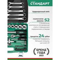 Высокое качество всех элементов набора для автомобиля порадует автомобилиста любого стажа и квалификации, а универсальность комплектации позволит использовать набор как инструменты для дома. Набор торцевых головок, бит, ключей имеет высокие показатели твердости , что говорит о долгом сроке службы и устойчивости к сильным нагрузкам, за счет чего, данный комплект можно использовать как профессиональный инструмент для автосервиса.