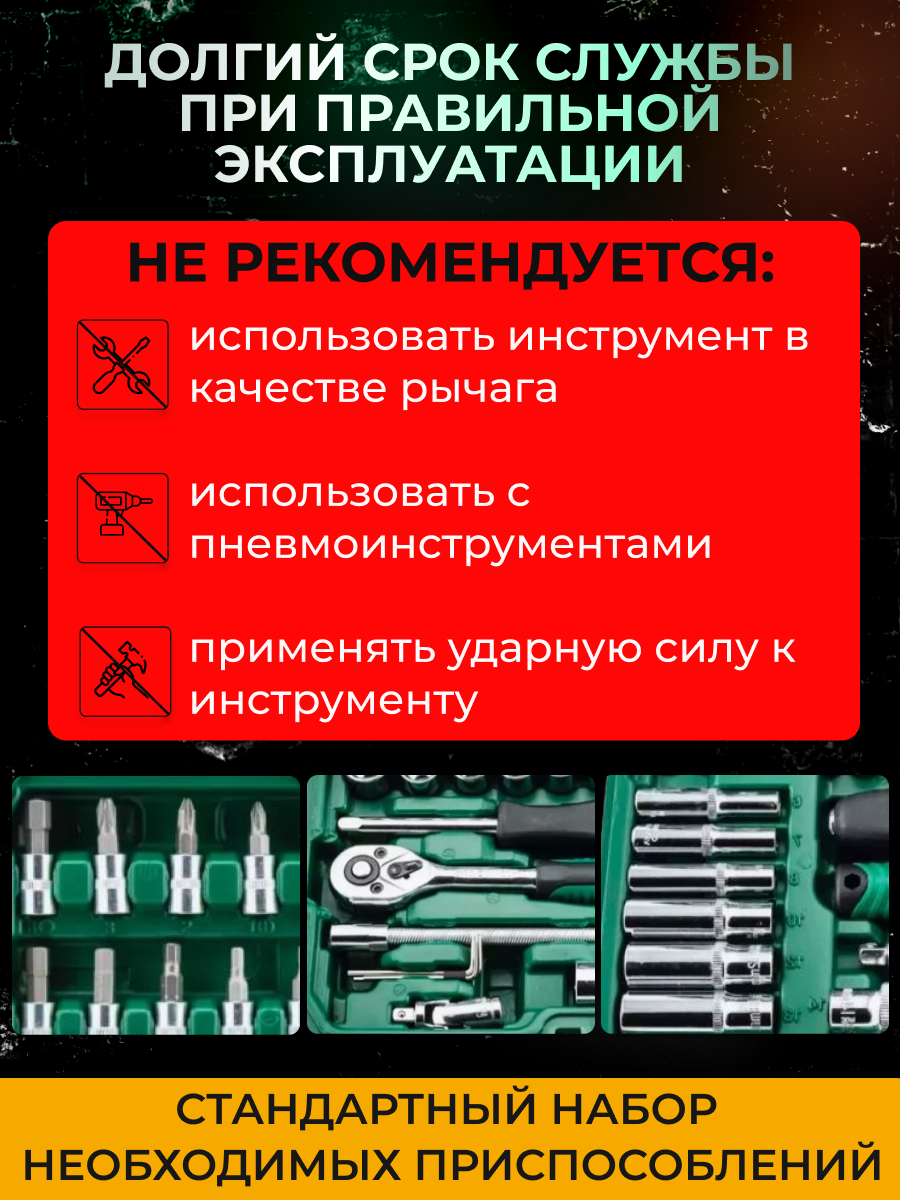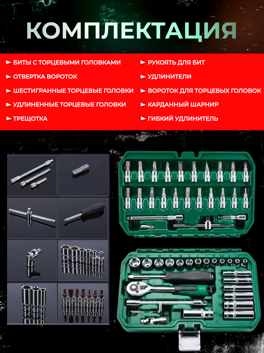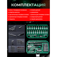 | Инструменты в комплекте | вороток для головок, ключи торцевые, отвёртки, рукоять для головок, трещотка |