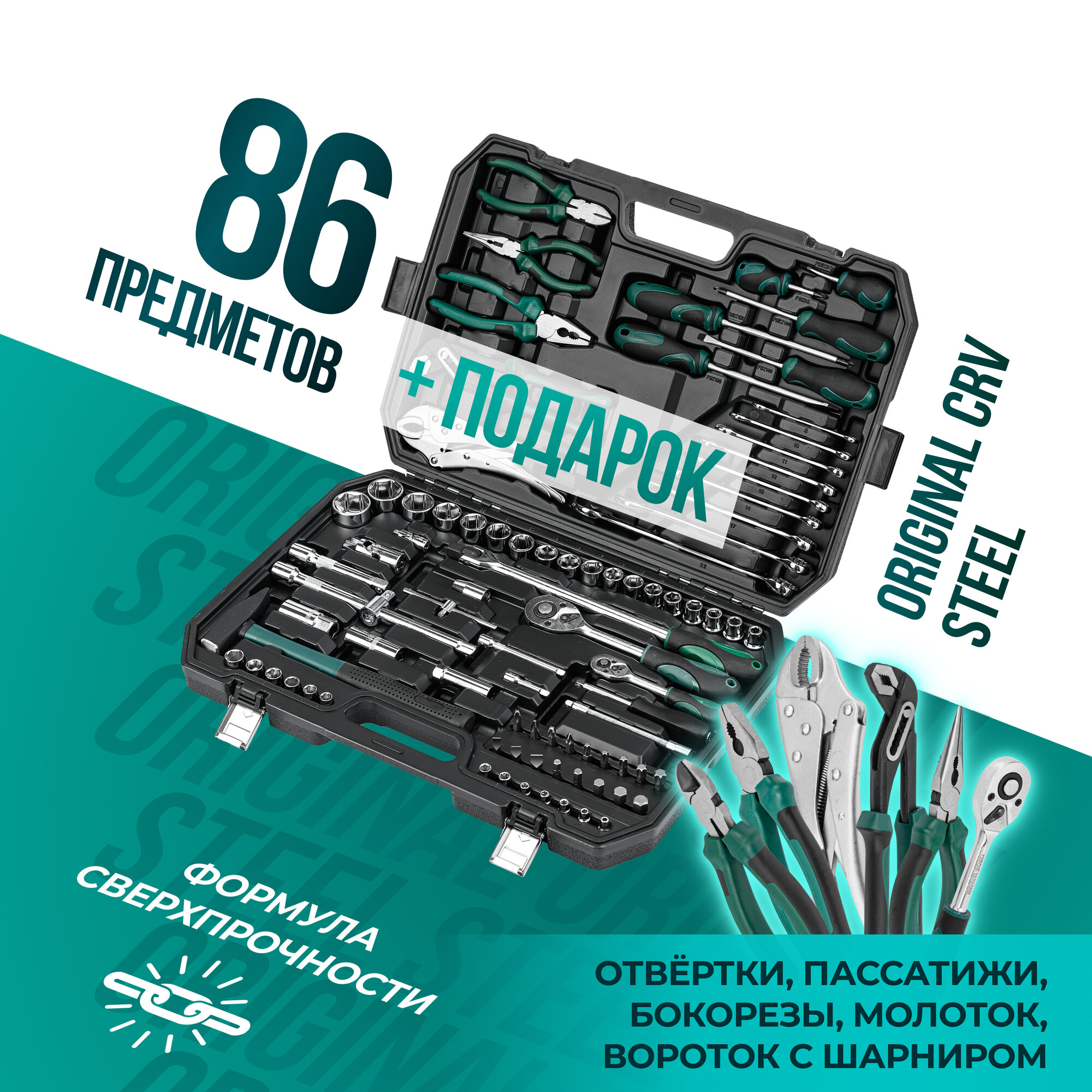 Выбираете надежный набор инструментов для дома? Вы на верном пути! Набор из 86 предметов соответствует самым высоким требованиям, изготовлен из высококачественной сверхпрочной хромованадиевой стали, которая применяется при производстве качественного инструмента и оснастки. Набор составлен из инструментов, которые необходимы в каждой квартире, а так же он может применяться при ремонте автомобиля и другой техники и ТО auto. Компактный пластиковый чемодан с защелками и с ручкой удобно переносить и хранить в машине, мастерской или в гараже.