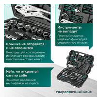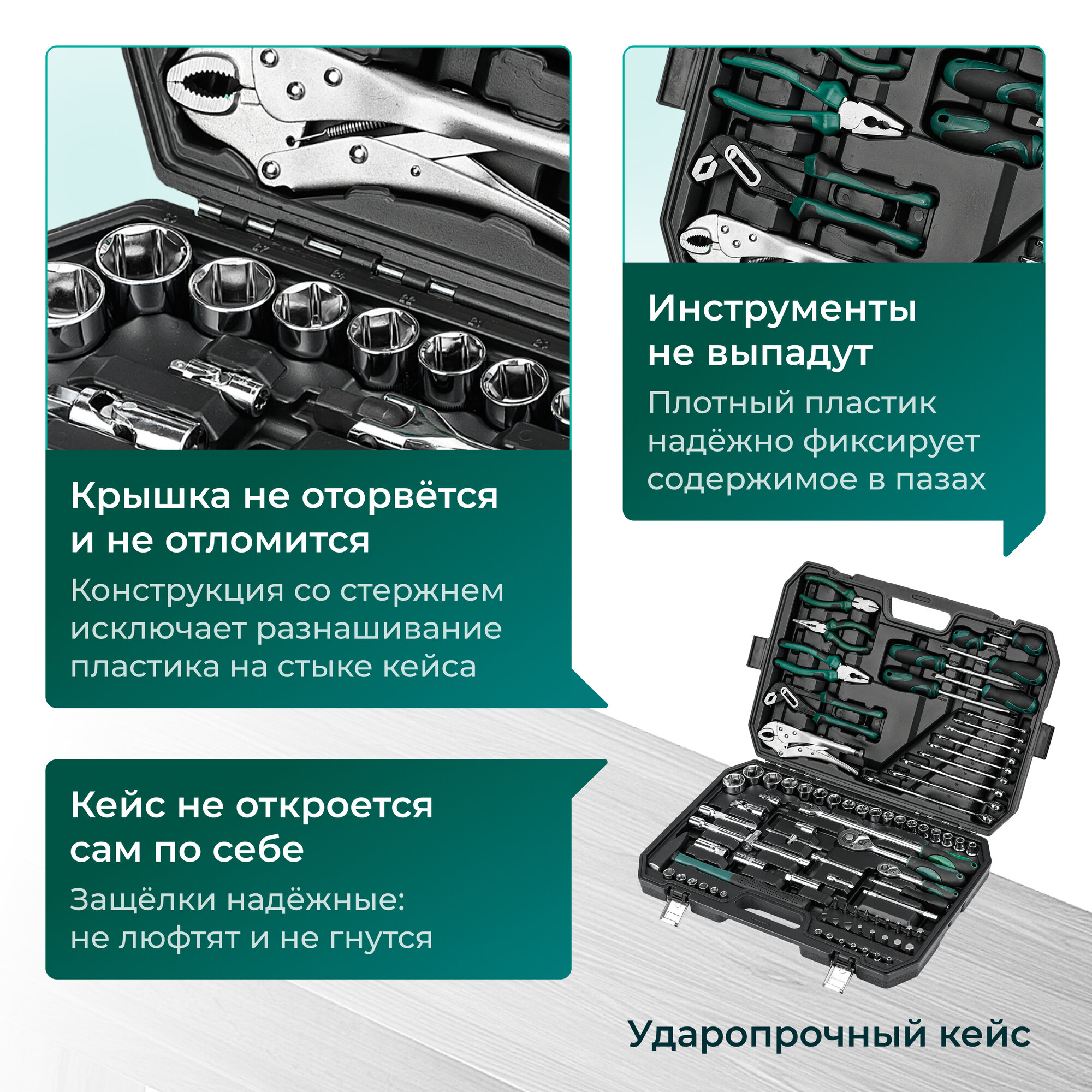 Набор составлен очень грамотно, он необходим не только авто механику, но и домашнему мастеру при ремонте или сборке мебели, сантехники, бытовой техники и других мелких ремонтных работах дома, в квартире, на даче. Каждый предмет зафиксирован в своем посадочном месте, а значит Вы можете быть уверены, что в ящике с инструментами всегда будет порядок и они не перемешаются при транспортировке чемоданчика.