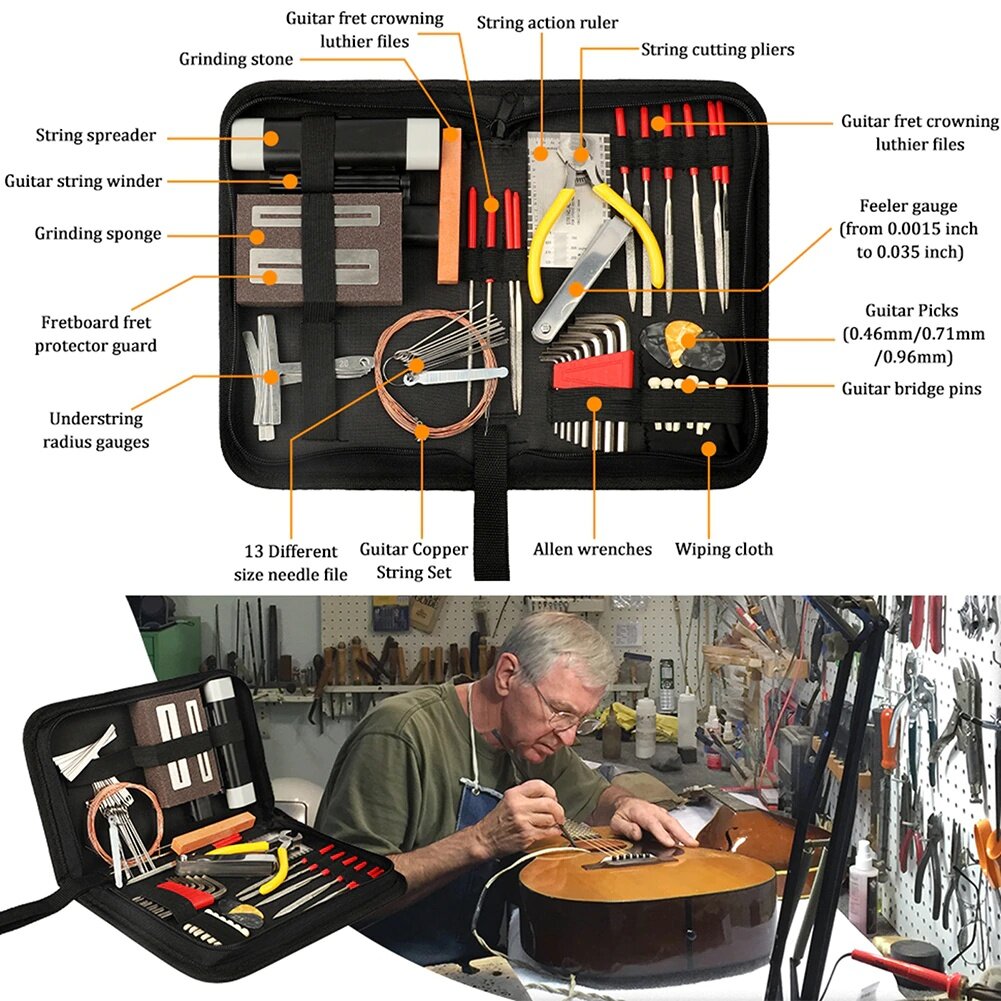 Многофункциональность: с помощью наших инструментов для гитары вы можете сделать необходимые измерения и регулировку Портативный дизайн, легко носить с собой В комплект для ремонта гитары входит инструмент смены струн и настройки, что очень подходит для поддержания хорошей работы музыкальных инструментов. Ремкомплект для гитары, инструмент настройки, проверки и регулировки высоты струны и многое другое. Полная комплектация показана на фото
