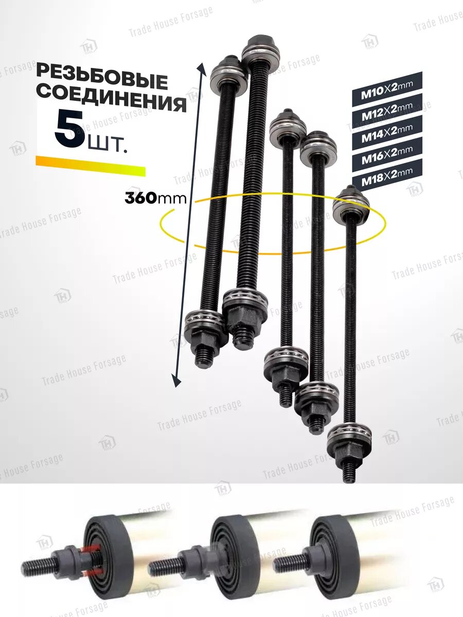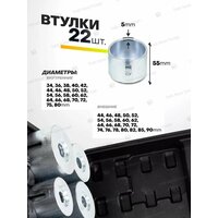 Комплектация: 5 винтов (M10, M12, M14, M16, M18), проставки 22 шт. (34/44, 36/46, 38/48, 40/50, 42/52, 44/54, 46/56, 48/58, 50/60, 52/62, 54/64, 56/66, 58/68, 60/70, 62/72, 64/74, 66/76, 68/78, 70/80, 72/82, 75/85, 80/90 мм.), кейс.