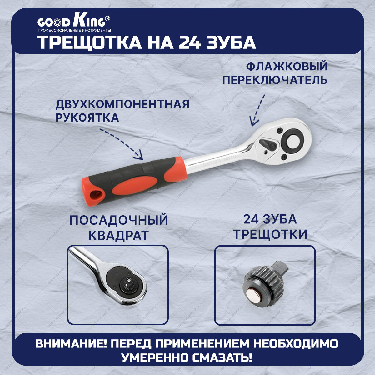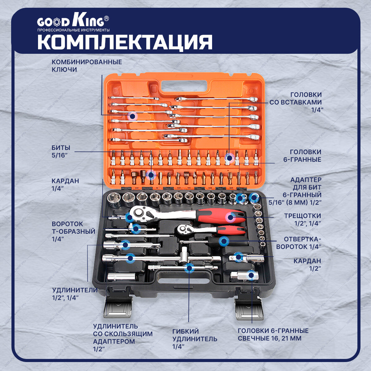 | Дополнительная информация | Комплектация 12 шт. — 1/2" Головка: 8, 10, 12, 13, 14, 15, 16, 17, 18, 19, 22, 24 мм 1 шт. — 1/2" Торцевая головка 8 мм 7 шт. — 1/4" Головки: 7, 8, 9, 10, 11, 12, 13 мм 2 шт. — 1/2", 1/4 Трещоточный ключ 1 шт. — 1/4" Отвертка под съемные головки (квадрат) 2 шт. — 1/2", 1/4" Карданный шарнир 3 шт. — 1/2" Вороток с плавающей головкой 5", 10", удлинитель 2 шт. — Головки свечные 16 мм, 21 мм 3 шт. — 1/4" Удлинитель, вороток, вороток гибкий 33 шт. — 1/4" Шестигранные головки: звезда T8-10-15-20-25-30-40, шестигранник 3-4-5-6, крест PZI-2 PH1-2, плоская 4-5.5-6.5, насадка S2 шестигранник 8-10-12-14, крест PZ3-4 PH3-4, плоская 8-10-12, звезда 40-45-50-55 11 шт. — Комбинированный ключ: 8, 10, 11, 12, 13, 14, 15, 16, 17, 18, 19 мм |