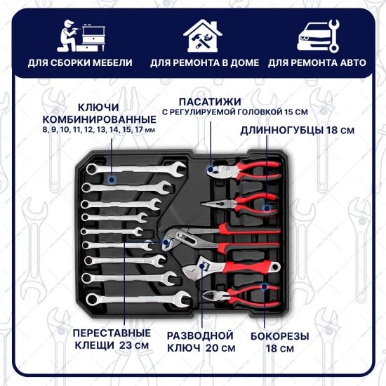 бита-адаптер для торцевых головок, гибкий удлинитель для бит, гибкий удлинитель для головок, держатель для бит, набор крепежа, нож, ножницы, отвертка индикаторная, рулетка, телескопический магнитный щуп, удлинитель для бит, удлинитель для головок, уровень, шарнир карданный для головок