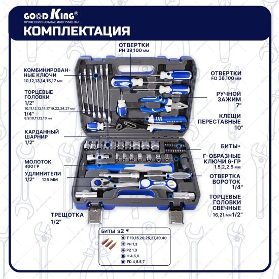 | Дополнительная информация | Комплектация Торцевые головки 1/4": 8, 9, 10, 11, 12, 13 мм; Отвертка-вороток 1/4"; Биты 1/4" 25мм: TX10, 15, 20, 25, 27, 30, 40, PZ1, 3, FD4, 5.5, 7, HEX3, 4, 5, 6, PH1, 3; Торцевые головки 1/2" : 10, 11, 12, 13, 14, 17, 19, 22, 24, 27 мм; Удлинитель 1/2" 125 мм; Свечные головки 1/2" 16 и 21 мм; Карданный шарнир 1/2"; Трещотка 1/2"; Ручной зажим 7"; Молоток 400гр; Переставные клещи 10"; Отвертки: PH2x38мм, FDx38мм, PH2x100мм, FDx100мм; Комбинированные ключи 10, 12, 13, 14, 15, 17 мм; Г-образные шестигранники 1.5, 2, 2.5 мм. |