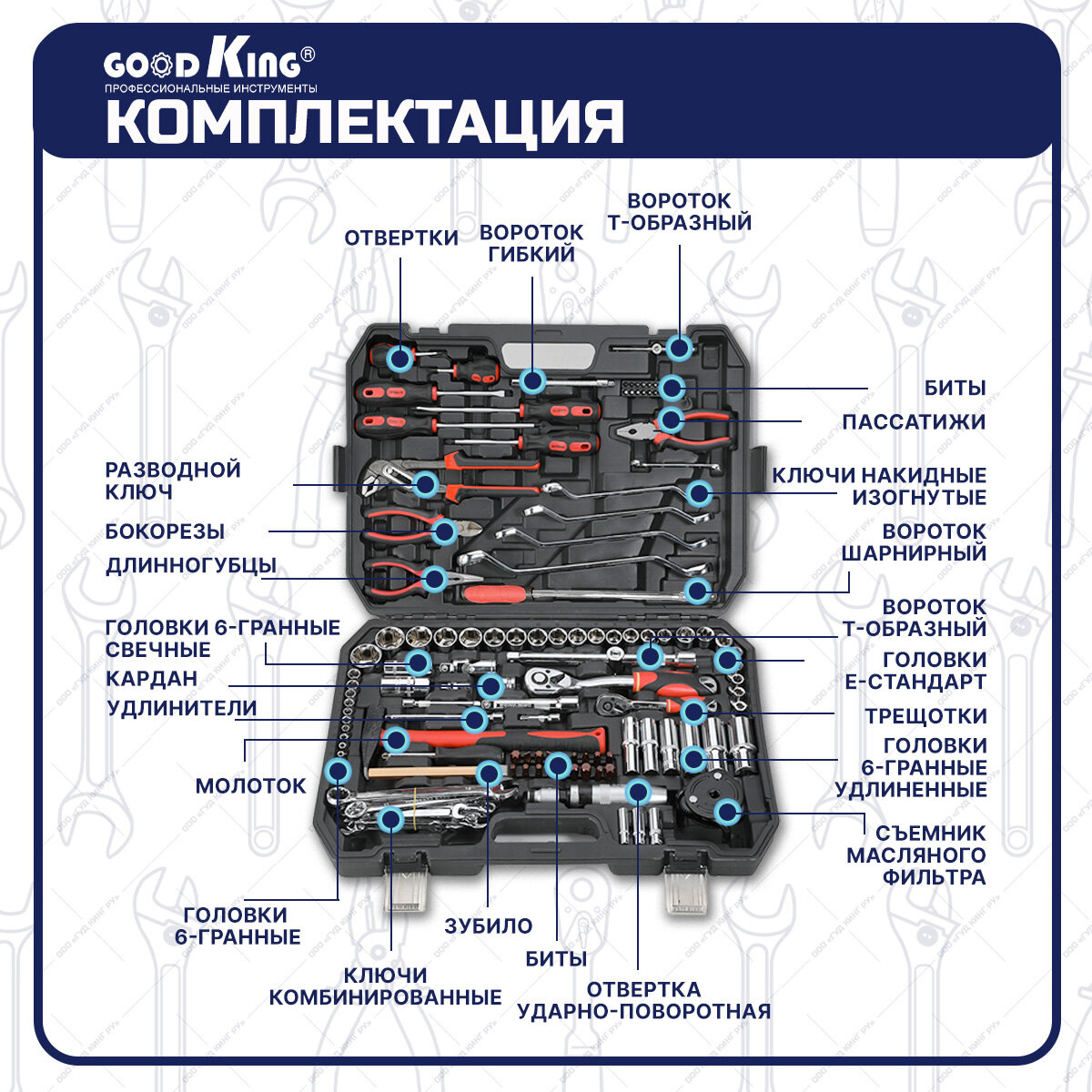 | Инструменты в комплекте | вороток для головок, длинногубцы, ключ разводной, ключи гаечные, круглогубцы, кусачки, молоток, отвёртки, пассатижи, плоскогубцы, трещотка |