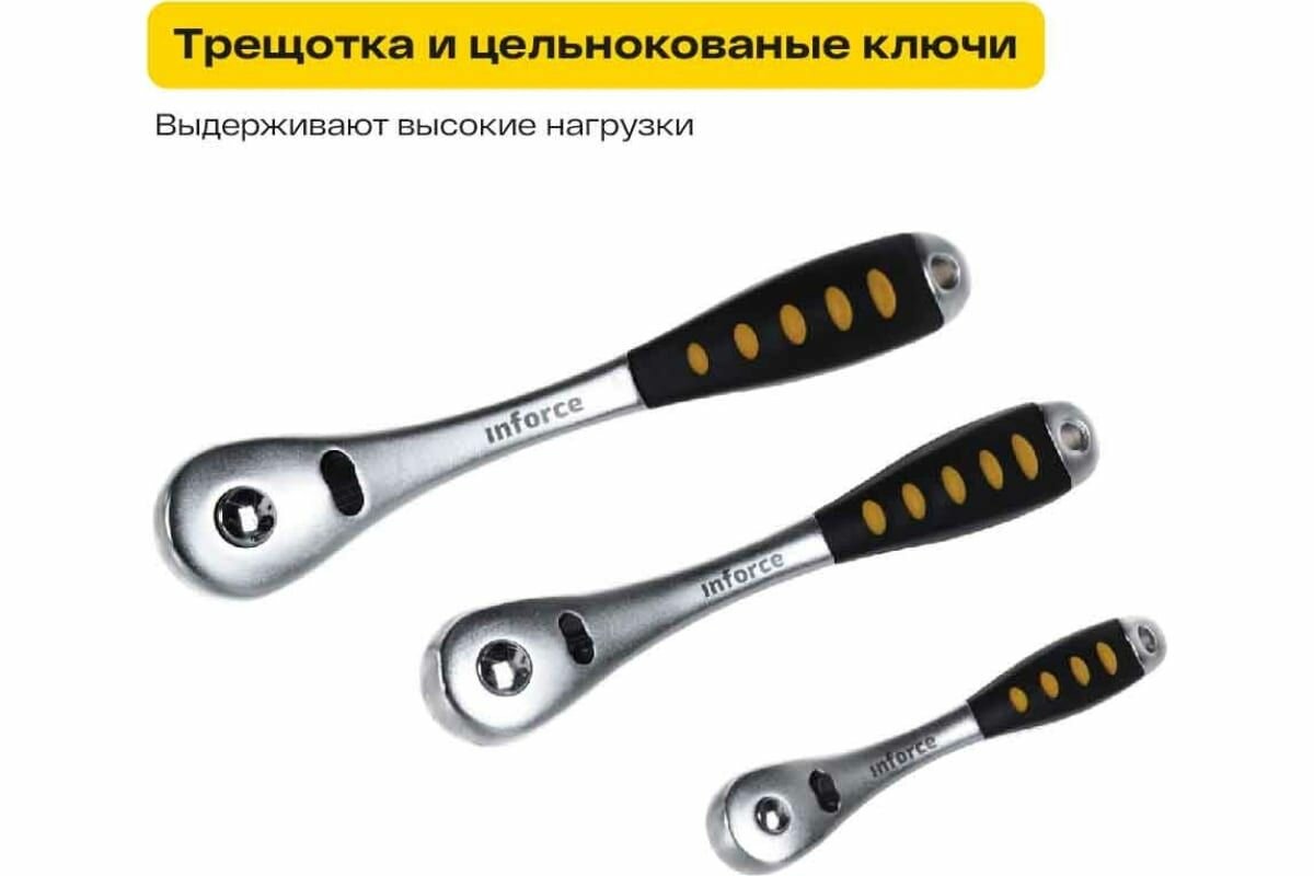 | Гаечные ключи подробно | 1/4" трещоточный ключ – 72 зубца; 3/8" трещоточный ключ – 72 зубца; 1/2" трещоточный ключ – 72 зубца; комбинированные ключи – 8; 9; 10; 11; 12; 13; 14; 16; 17; 18; 19 мм. |