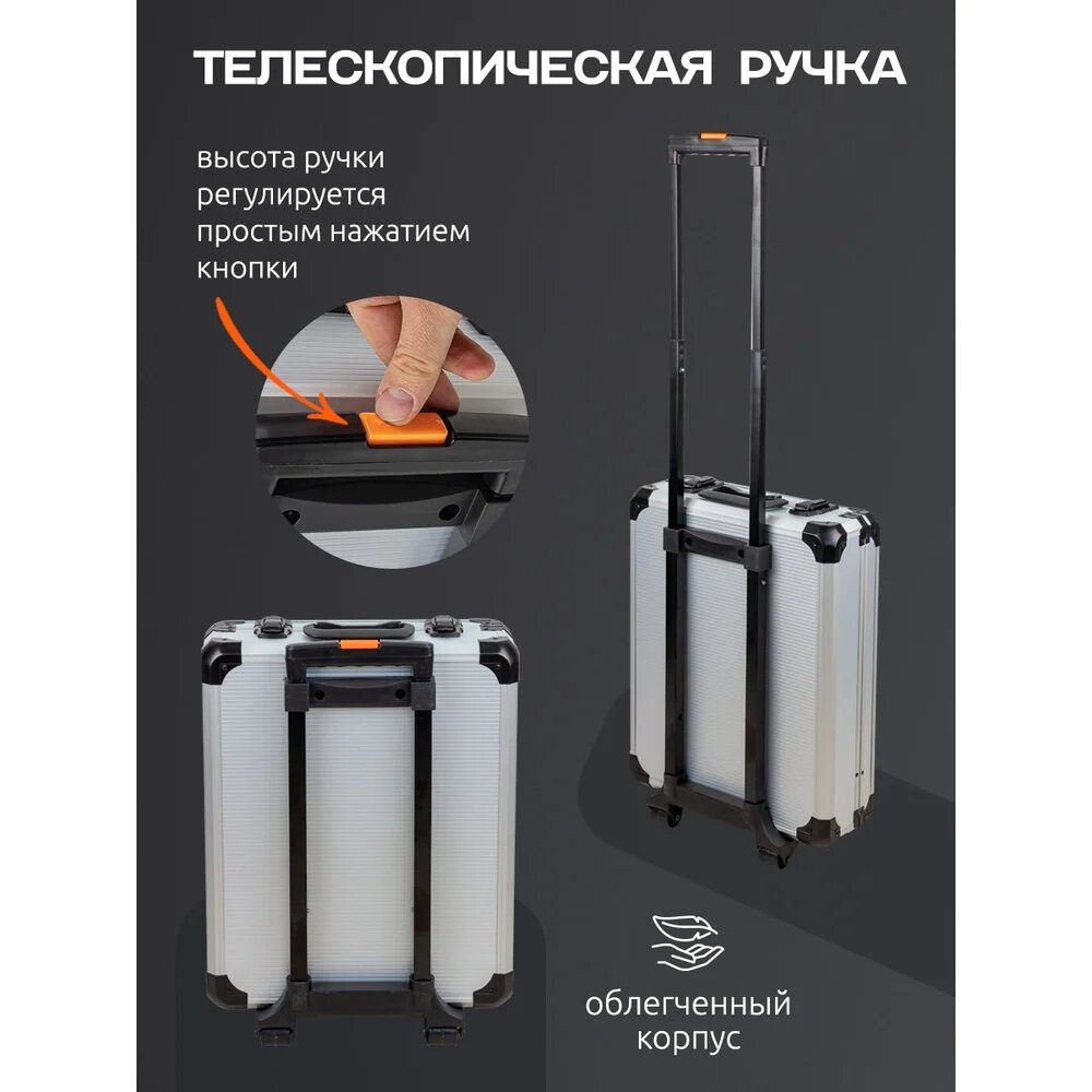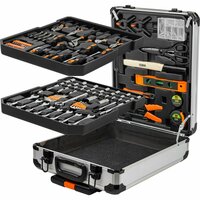 Трещотка 3/8Головки 1/4 короткие 4, 4.5, 5, 5.5, 6, 7, 8, 9, 10, 11, 12, 13, 14 мм - 13 шт.Головки 3/8 короткие 6, 7, 8, 9, 10, 11, 12, 13, 14, 15, 16, 17 мм - 12 шт.Карданы шарнирные 1/4 и 3/8 - 2 шт.Головки свечные 3/8 16, 21 мм. 2 шт.Удлинитель 3/8 70 ммУдлинитель гибкий 1/4 150 ммПереходник 3/8 на 1/4Измеритель давления в шинах 5-50 PSIБитодержатель 1/4Fх1/4FКлючи 6-гранные Г-образные: 1.5, 2, 2.5, 3, 4, 5, 5.5, 6 мм - 8 шт.Ключи Г-образные Torx 7шт: Т10, Т15, Т20, Т25, Т27, Т30, Т40 - 7 шт.Ключи комбинированные рожково-накидные 6, 8, 9, 10, 11, 12, 13, 15 мм - 8 шт.Бокорезы 150 ммДлинногубцы 150 ммКлюч разводной 150 ммПассатижи переставные 225 ммПассатижи двухпозиционные 150 ммМагнитный битодержатель 1/4Отвертки PH: 1х75 мм, 2х100 мм, 2х38 мм - 3 шт. SL: 4x75 мм, 5х75 мм, 6х38 мм, 6х100 мм - 4 шт.Отвертки ювелирные: SL2.4, SL 3.00мм, РН00, РН0 - 4 шт.Биты 1/4: РН0, РН1, РН2, РН3, PZ1, PZ2, SL3, SL4, SL5, SL6, SL7, S1, S2, S3, Т10, Т15, Т20, Т25, Т30, AD-битодержатель - 20 шт.Нож канцелярский 150 ммРулетка 3 мНабор крепежных деталей шурупы, гвозди 83 шт.Уровень строительный 225 ммМолоток 300 гр.Изолента 3 мЗажимы универсальные 75 мм - 2шт.Кримпер 200 ммНожницы 210 ммПередвижной металлический чемодан