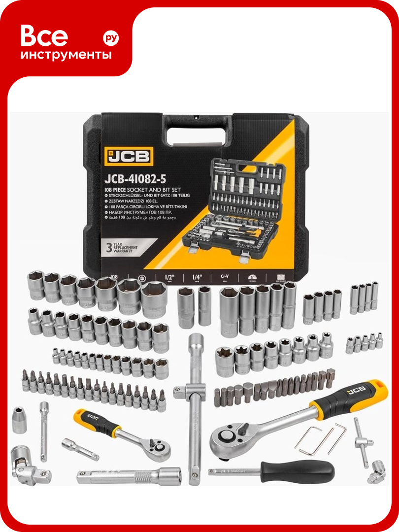 Набор инструментов от бренда JCB из 108 предметов в кейсе это функциональный комплект инструментов премиум класса, который обязательно порадует любого автолюбителя.